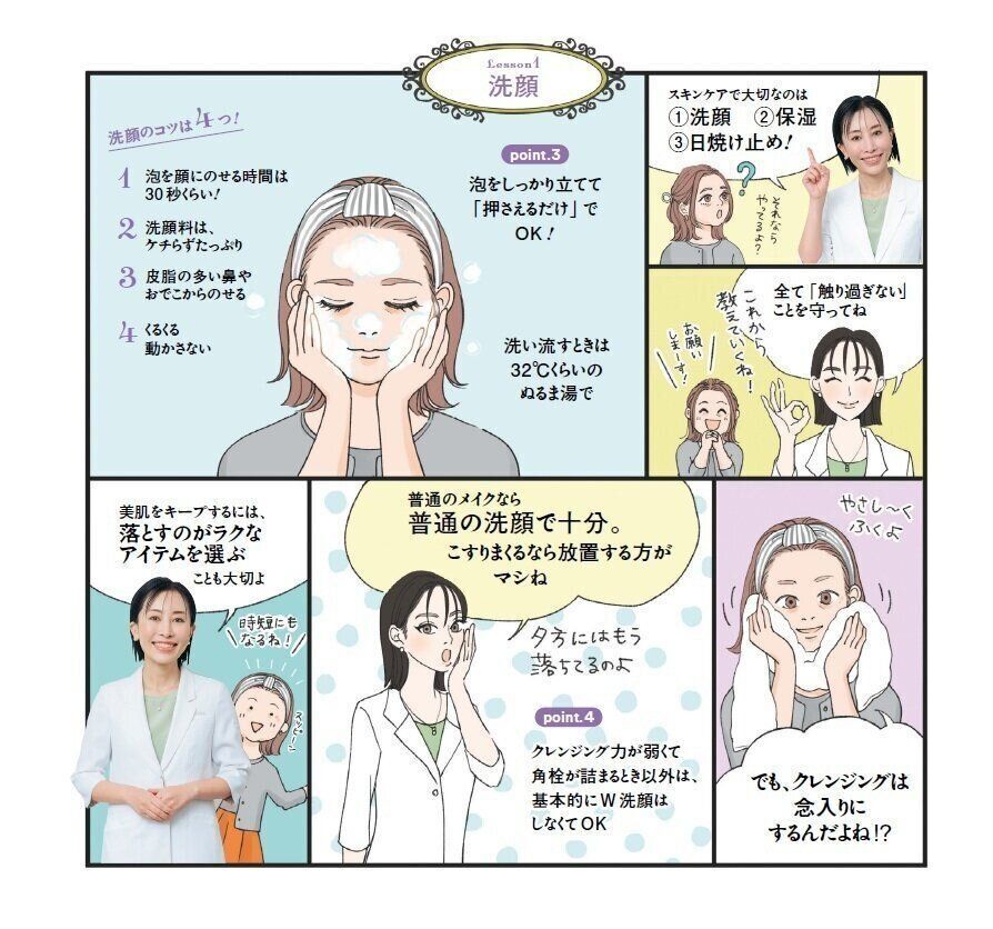 - 洗顔:洗顔料は泡立ちで選ぶ。洗いすぎはNG
