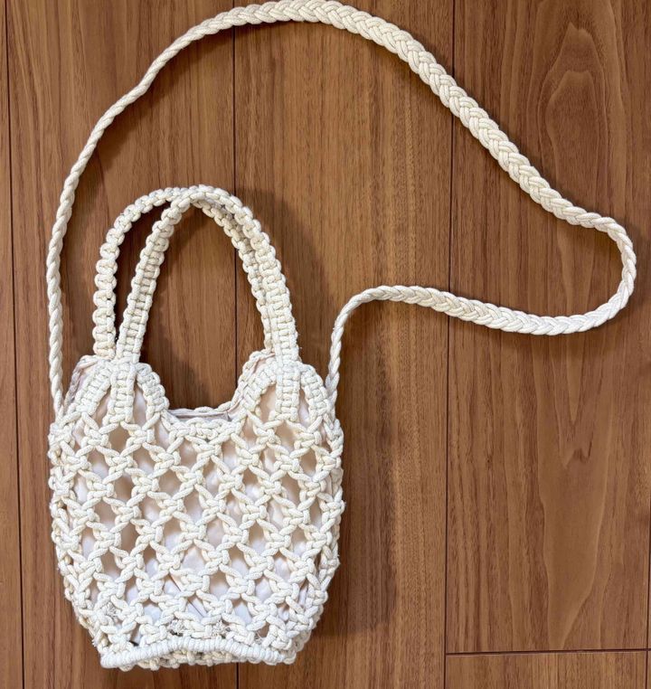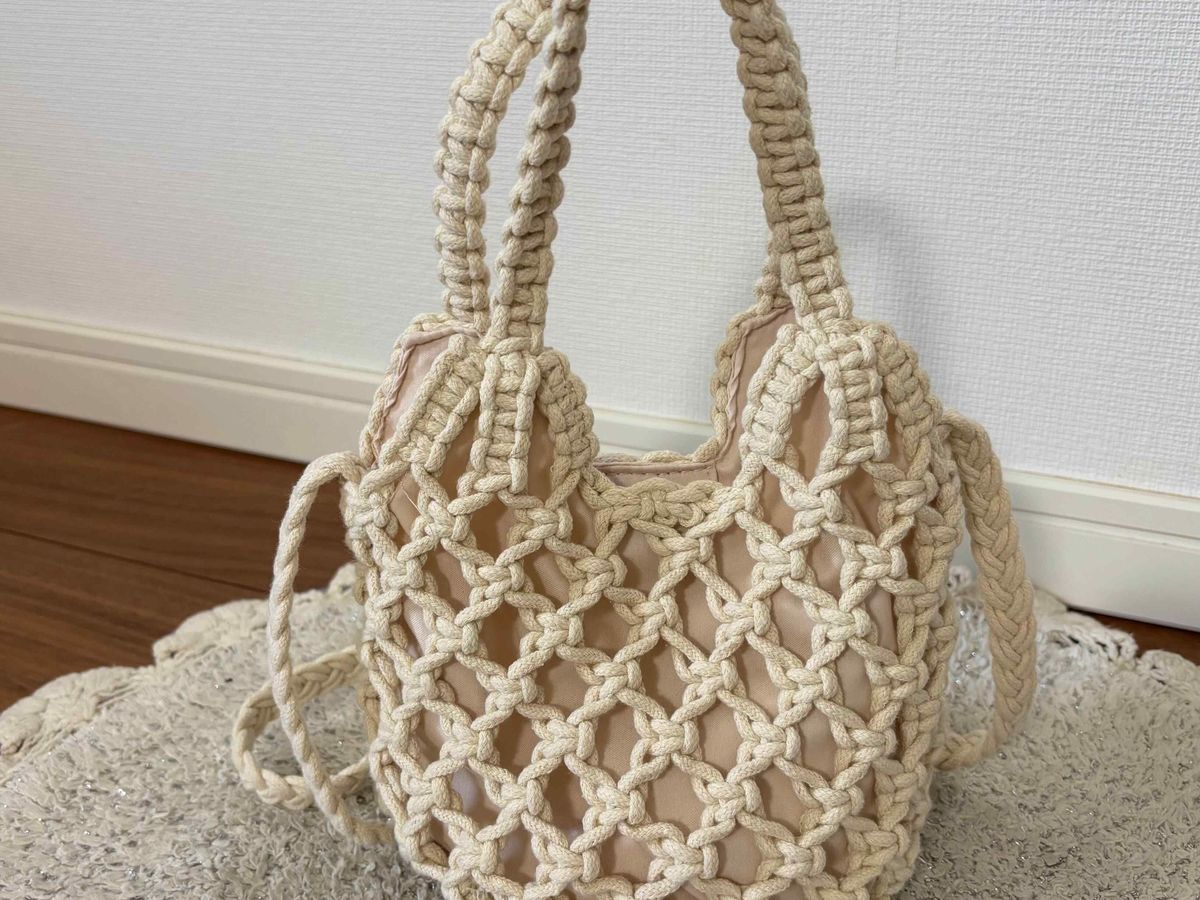 ざっくりとしたコード編みが涼やかで夏らしく、いつものバッグと代えるだけで簡単に季節感が出せるのがいいですね。