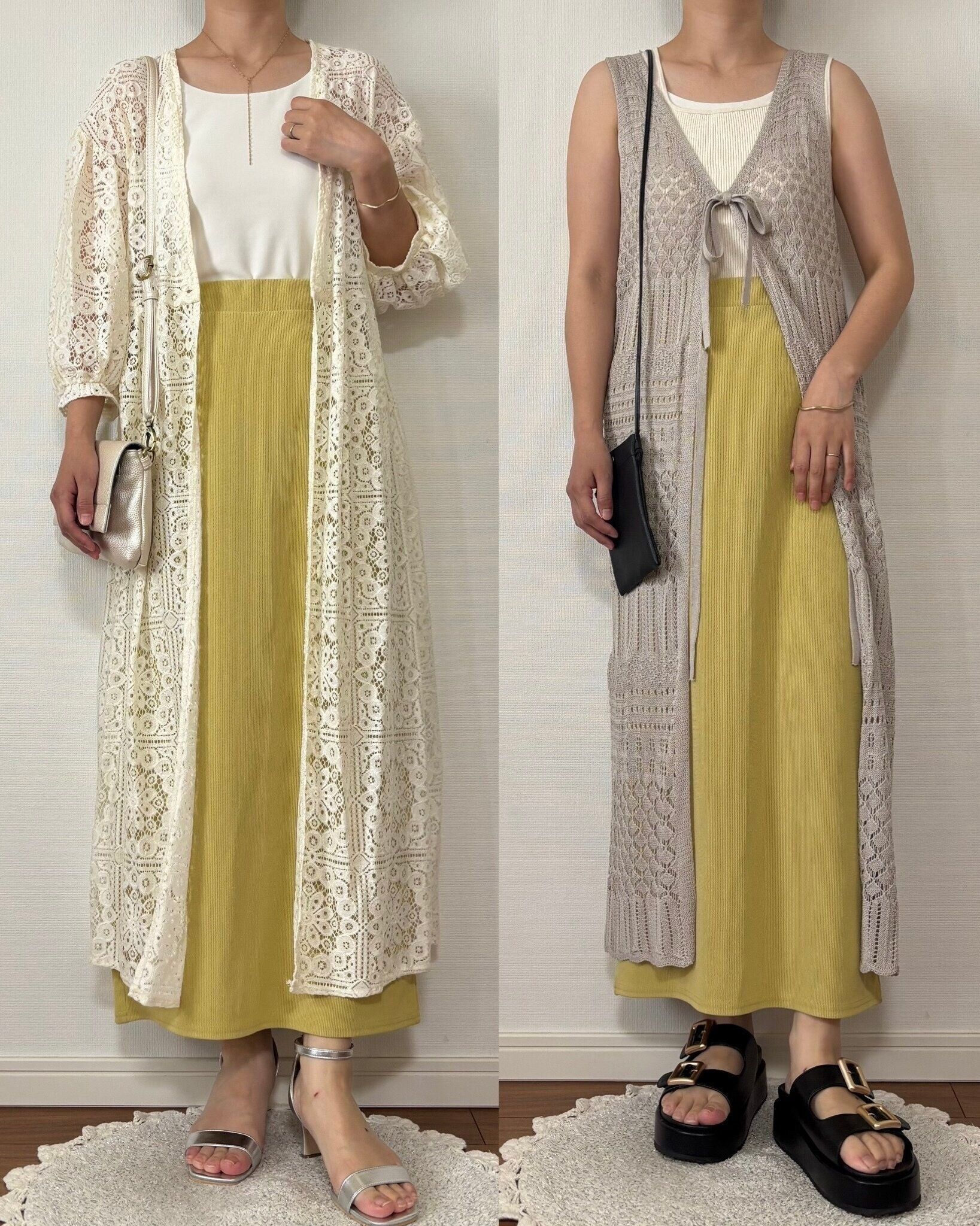 カラーアイテムに抵抗があるかたはトップスをロング丈にするのがおすすめ!羽織やロングジレのボトムとして取り入れるとカラーの見える面積が小さくなるのでチャレンジしやすくなりますよ。