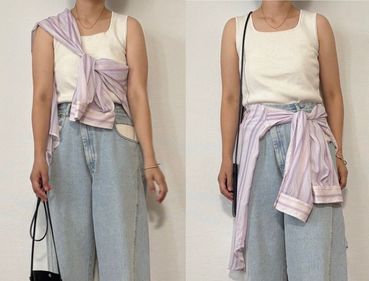 着ない時は腰に巻いたり斜めがけでさりげなく体型カバーもできますし、バッグの中に畳んで入れてもシワになりにくい素材なのが嬉しいですね。