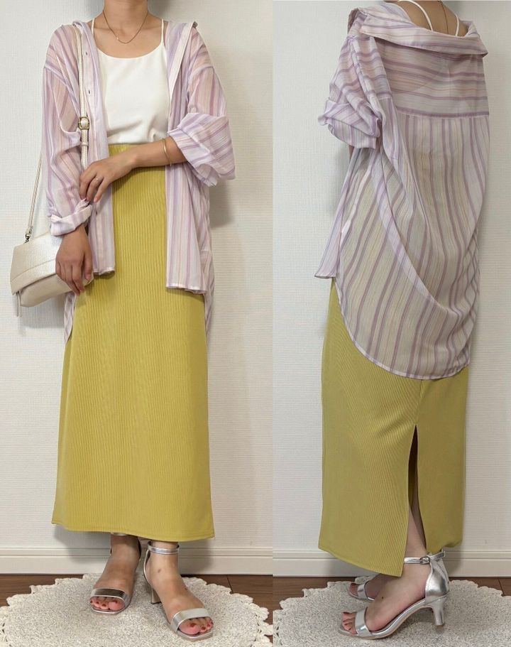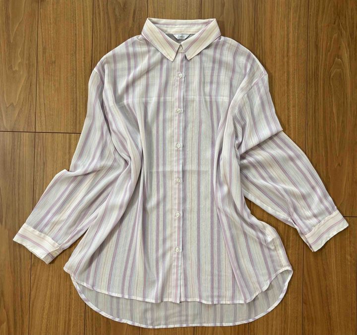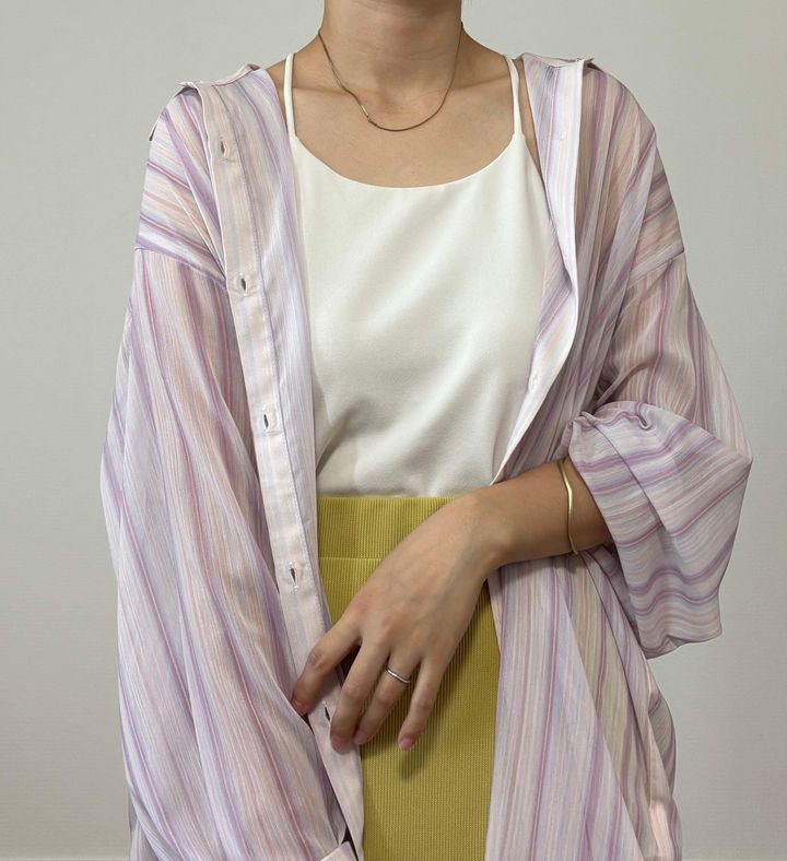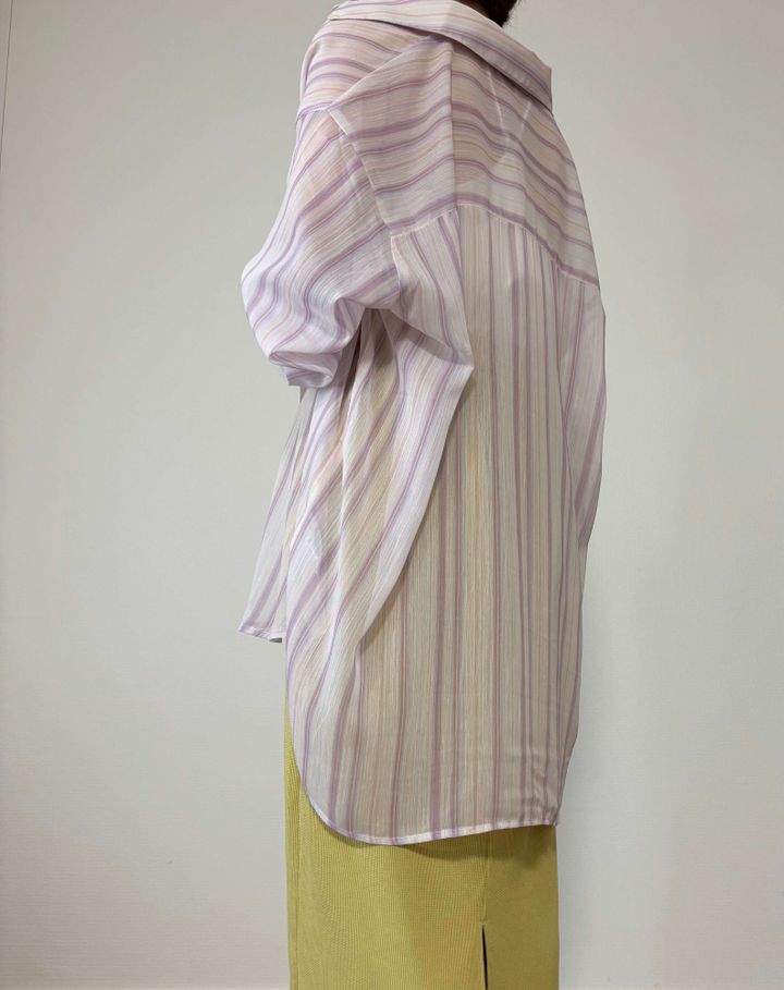 透け感はありますが、ストライプの柄が入っているので素肌がカモフラージュされてシアーシャツに苦手意識のある方も着やすい仕様になっています。