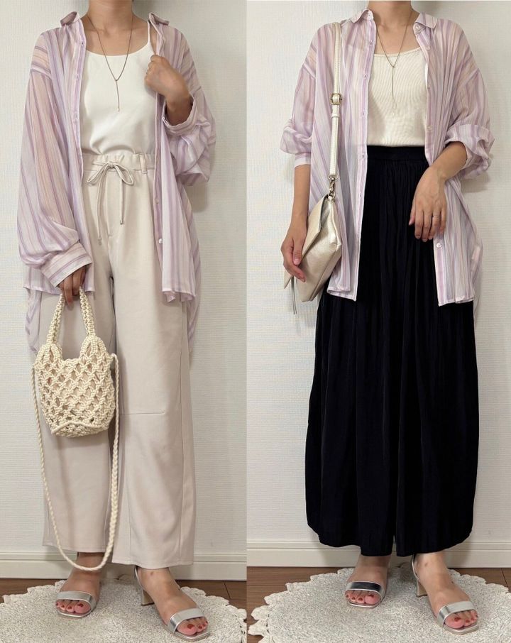 特にゆったり着られる大きめシルエットは気になる体型をカバーしつつ、シアー素材を選ぶことでトレンド感と抜け感のどちらもプラスしてくれる万能アイテム。
