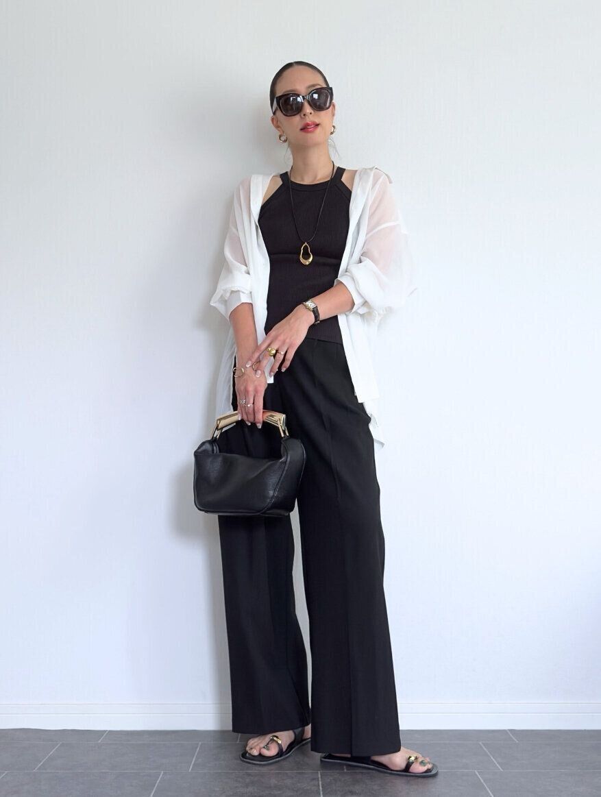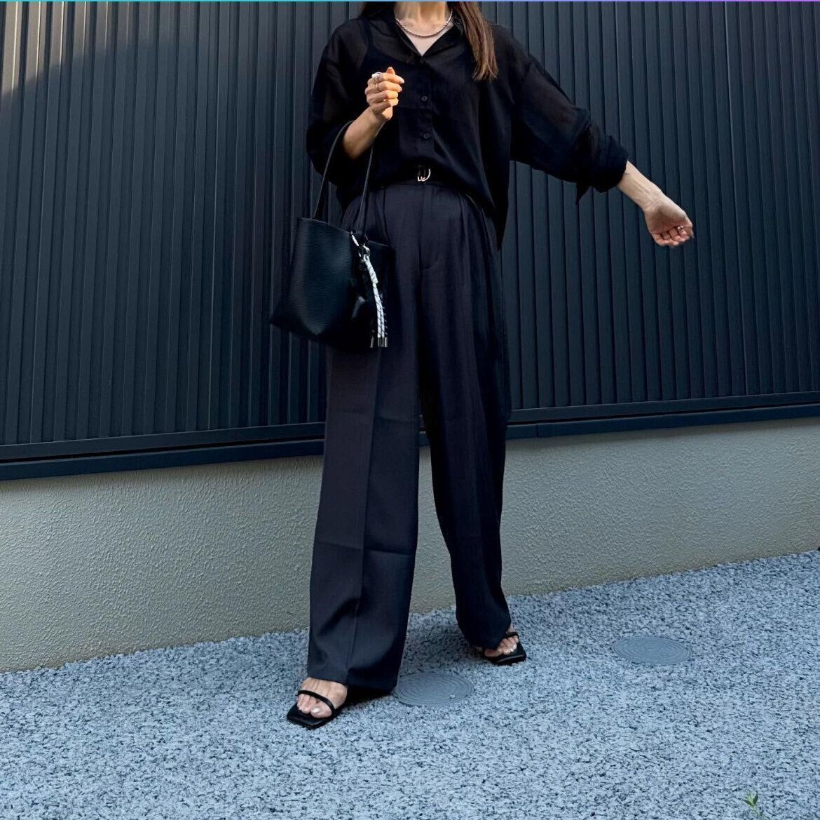 ハンサムコーディネートが好みな人におすすめなのが、黒の「シアーシャツ」を使ったオールブラックコーディネート。ブラックで全身あわせても、「シアーシャツ」が抜け感をプラスしてくれるので重たくなりません。残暑が厳しい今の時季にピッタリ!