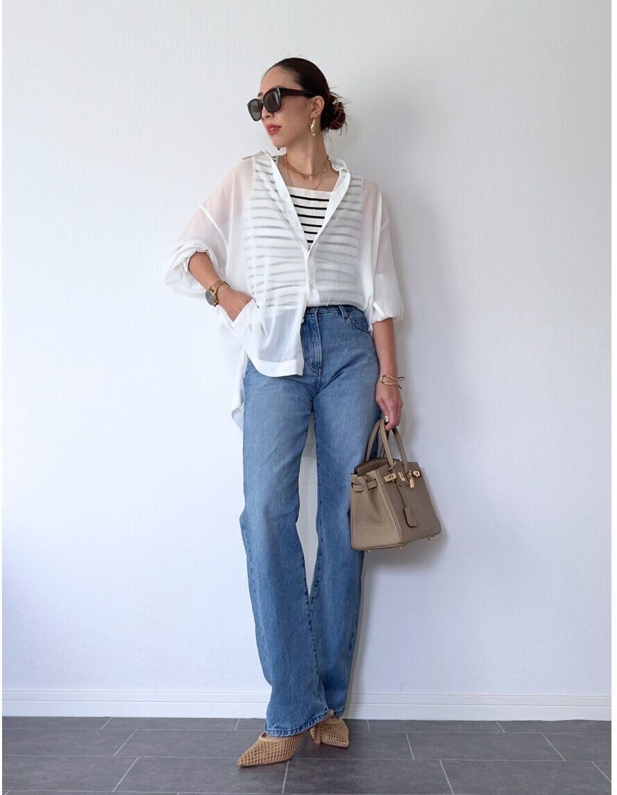ノースリーブのトップスをあわせた夏のデニムスタイルもユニクロの「シアーシャツ」をあわせれば真夏から晩夏の印象をあたえるデニムスタイルに早変わり!さらに秋を意識したカラーのバッグやシューズをあわせることで夏っぽさを感じないスタイルが完成します。
