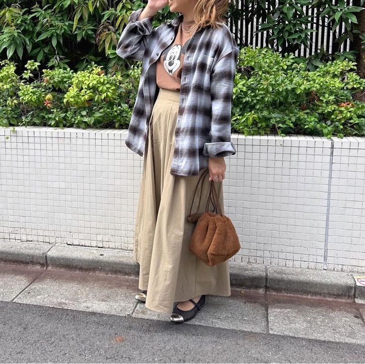 メンズライクな印象の強い「フランネルシャツ」ですが、スカートとも相性抜群。かわいらしい印象のアイテムの中に「フランネルシャツ」をプラスすることで、おしゃれな甘辛ミックスコーデが完成します。羽織としてだけでなく、コーディネートの印象を変えることができるなんて、優秀すぎる!