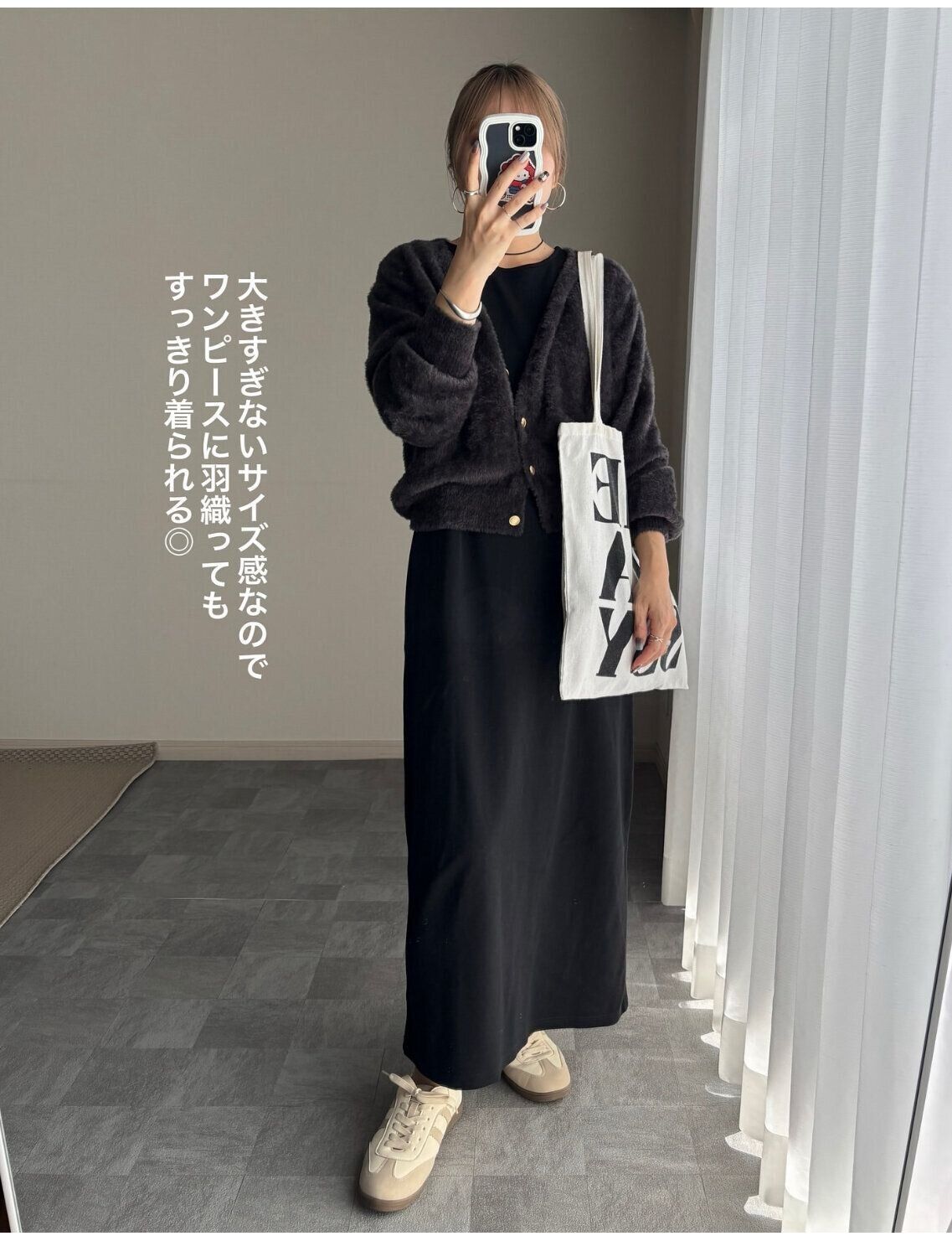 「EシャギーVネックCD」(1,969円)はカラーバリエーションの豊富なシャギーカーディガン。その中でも1枚は持っておきたいベーシックカラーのダークグレーは、あわせるアイテムを選ばないので幅広いコーディネートで大活躍してくれます。重ねるアイテムを選ぶのに悩みがちなワンピースとも相性抜群!