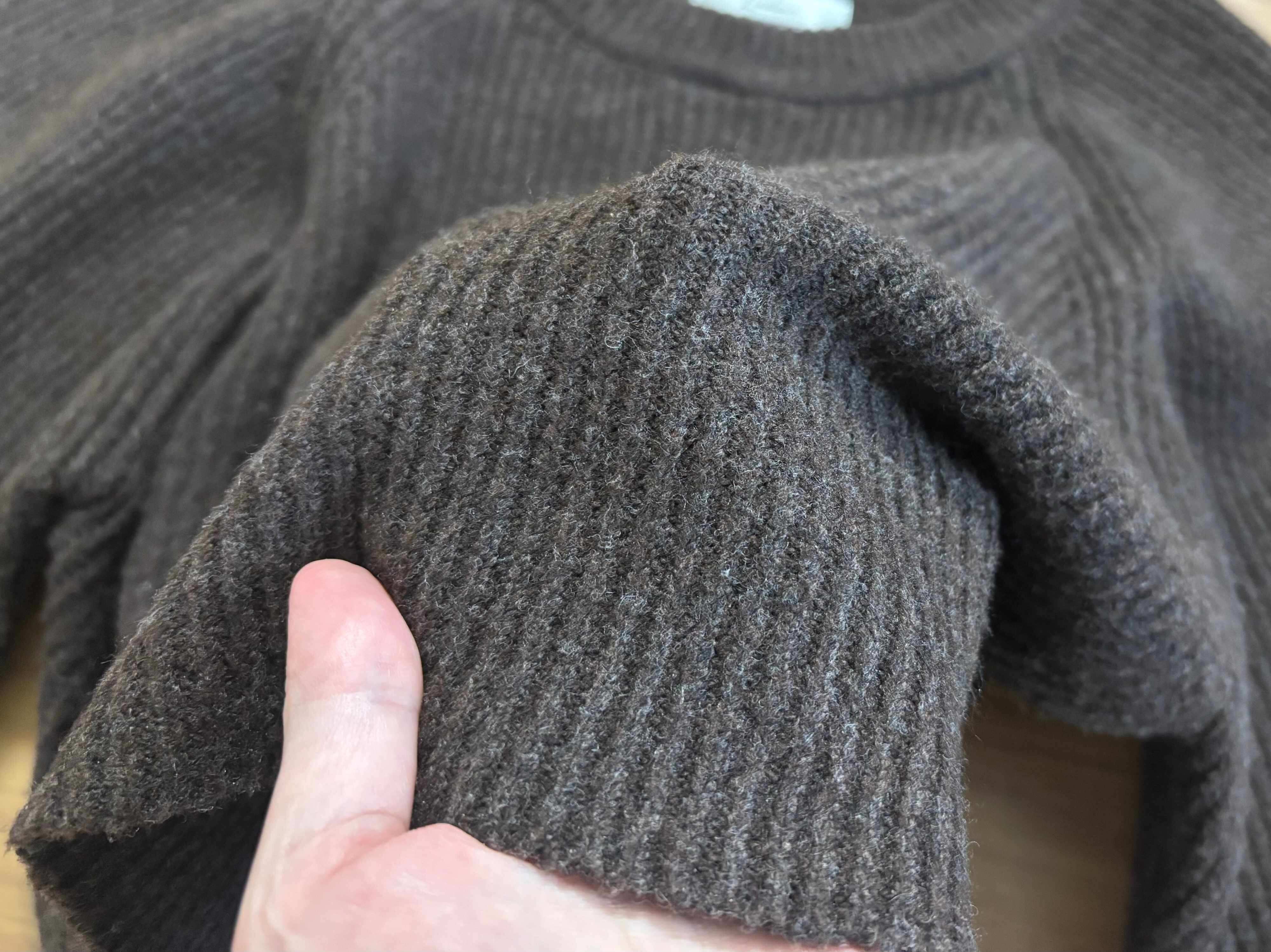 それに対してタイトなウエストデザインと肘のあたりで大きく外側にカーブした丸みのあるシルエットが女性らしい印象もありカジュアルになりすぎないニットです。