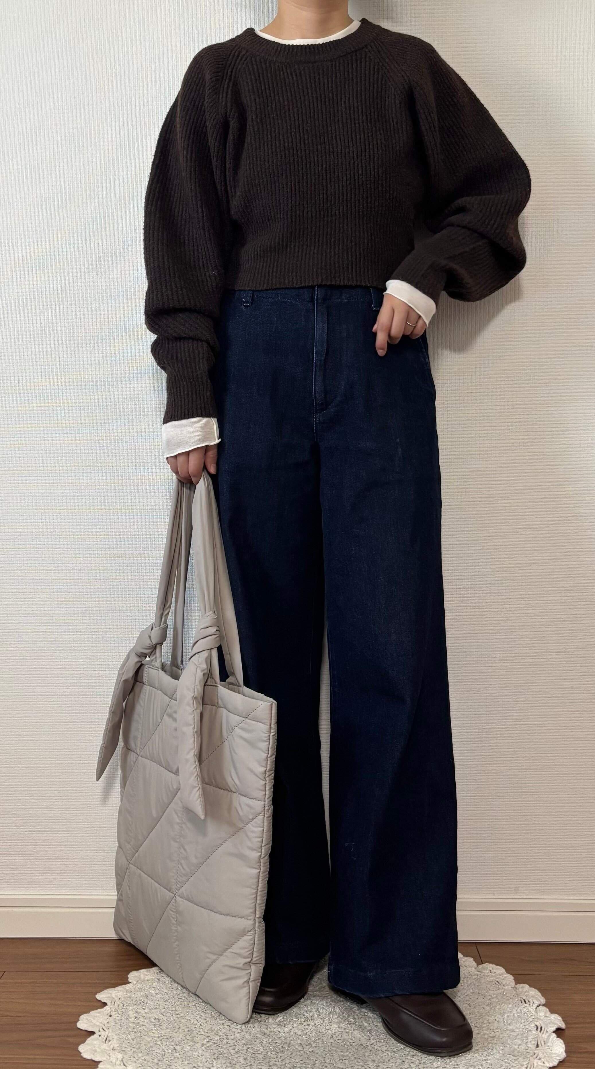 丈が短いのに対し、袖のボリュームと長さがあるので着るだけでスタイルアップする優秀ニットです。