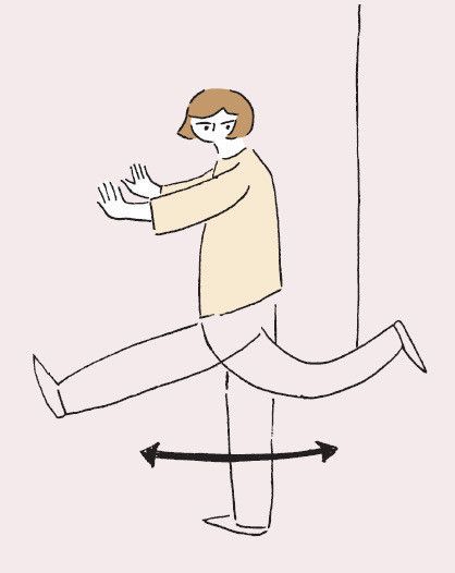 バレリーナのイメージで脚をつけ根から、ひざを曲げないようゆっくり大きく前後に上げ下げ。片脚1分ずつ筋肉を意識して行う。ぐらつく場合は壁などに手を添えて