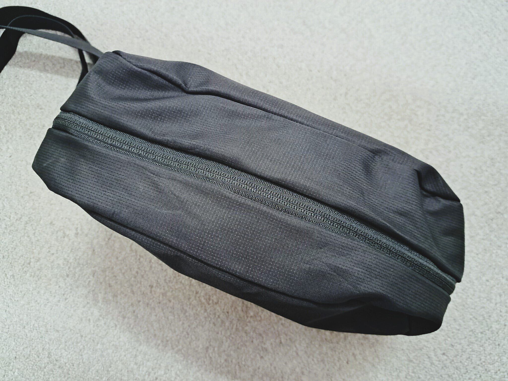 そして、商品のタグに書かれていた説明どおり、リュックのメインファスナーをガバッとひらいて、リバーシブルな状態に、完全に裏返して丸めると、なんとそのままショルダーバッグになるのです。