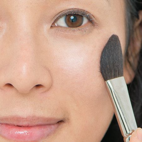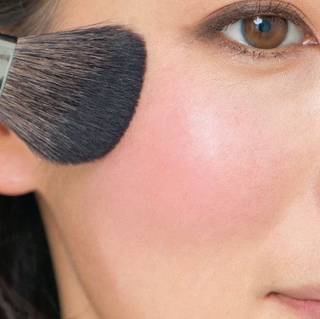 パール入りでこっくりとした赤系のチークを大きめのブラシに取り、頬の高い所からこめかみに向かって斜め上方にフワッとなじませる