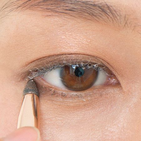 茶系のアイシャドウを上まぶたにつけたら、同じアイシャドウを下まぶたにもつける。目の中央から目尻に向かってサッとぼかす