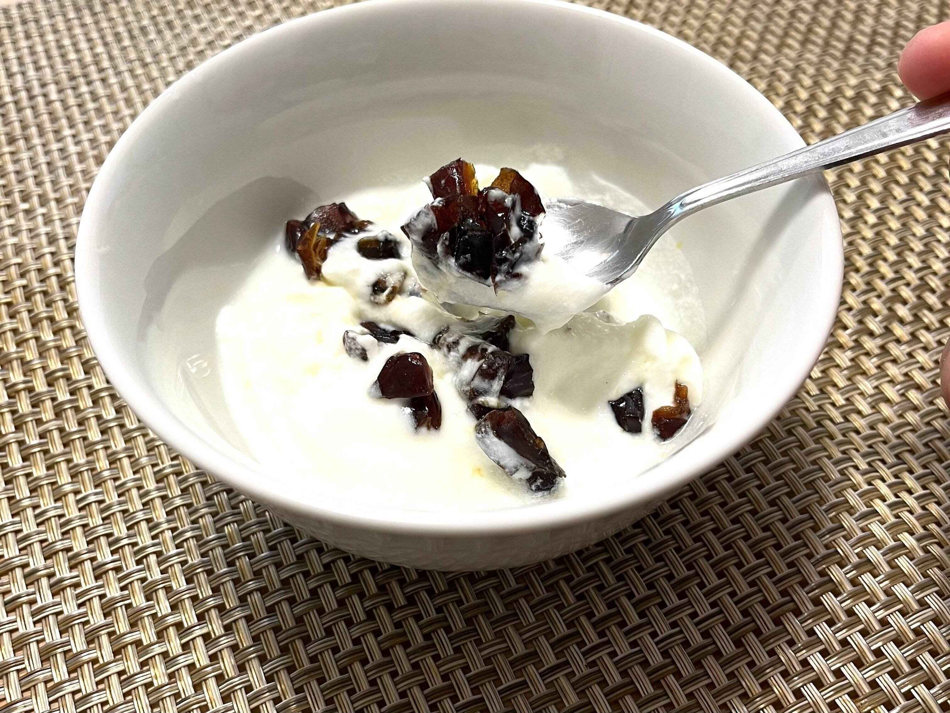 そのまま食べるのに飽きたら、デーツを細かく刻み、ヨーグルトに混ぜて食べるのがおすすめ!