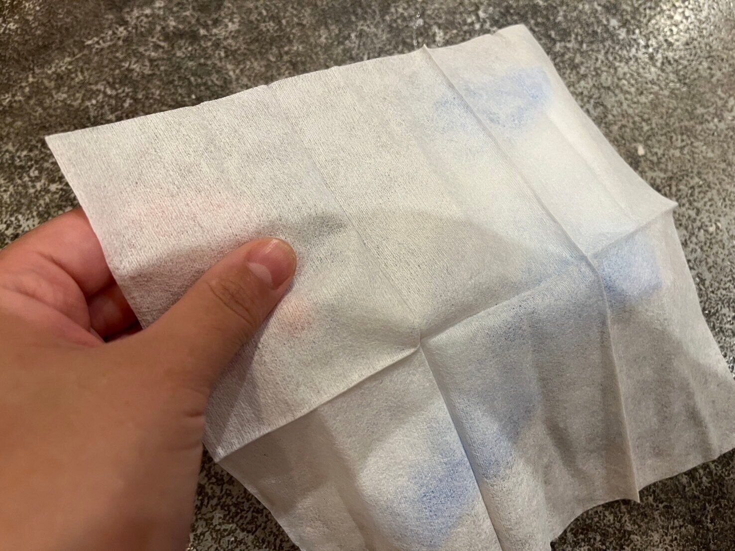 さて、クレンジングタオルで気になるのが使い心地ですよね。1枚の大きさはティッシュほどで、ウェットティッシュより少し分厚いくらい。顔を拭くのには小さいかな?と思いましたが、吸水力が抜群でこれ1枚でしっかり水分を拭き取れましたよ。