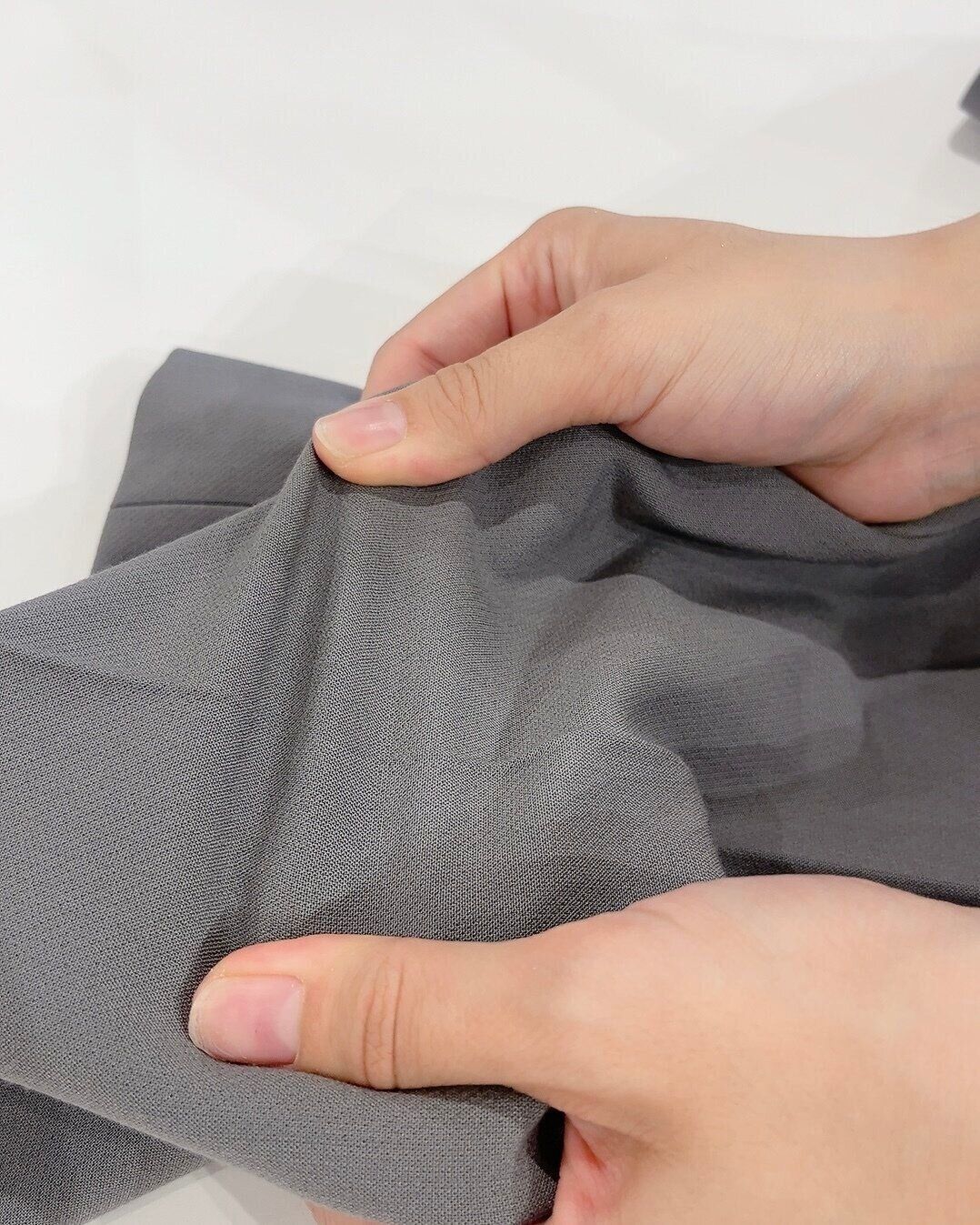 「誰もが美脚になれる」を叶えるために、素材選びにもこだわっているそう。脚に対する悩みは人それぞれ。ラインを拾いにくくし、ハリ感のある素材を採用。さらに、高密度で織られたやや硬めの生地は、シルエットも崩れにくく、補正されたような効果をもたらします。