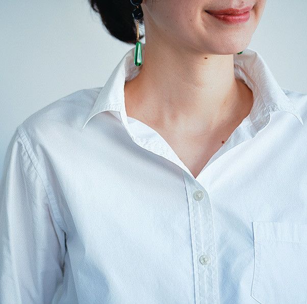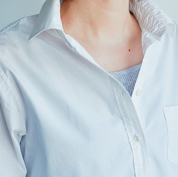 ボタンは、全部留めてしまうとヌケ感がなく新入社員のような印象に。ボタンを2つ開け、鎖骨が見えるくらいでヘルシーに着るのがちょうどよいバランスです