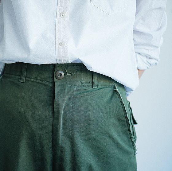 シャツとボトムスの間に、ベルトはもう必要ありません。NOベルトの適度なラフさを残したほうが、今っぽいおしゃれがかないます。どうしても1本というときは、茶色のシンプルなレザーベルトを