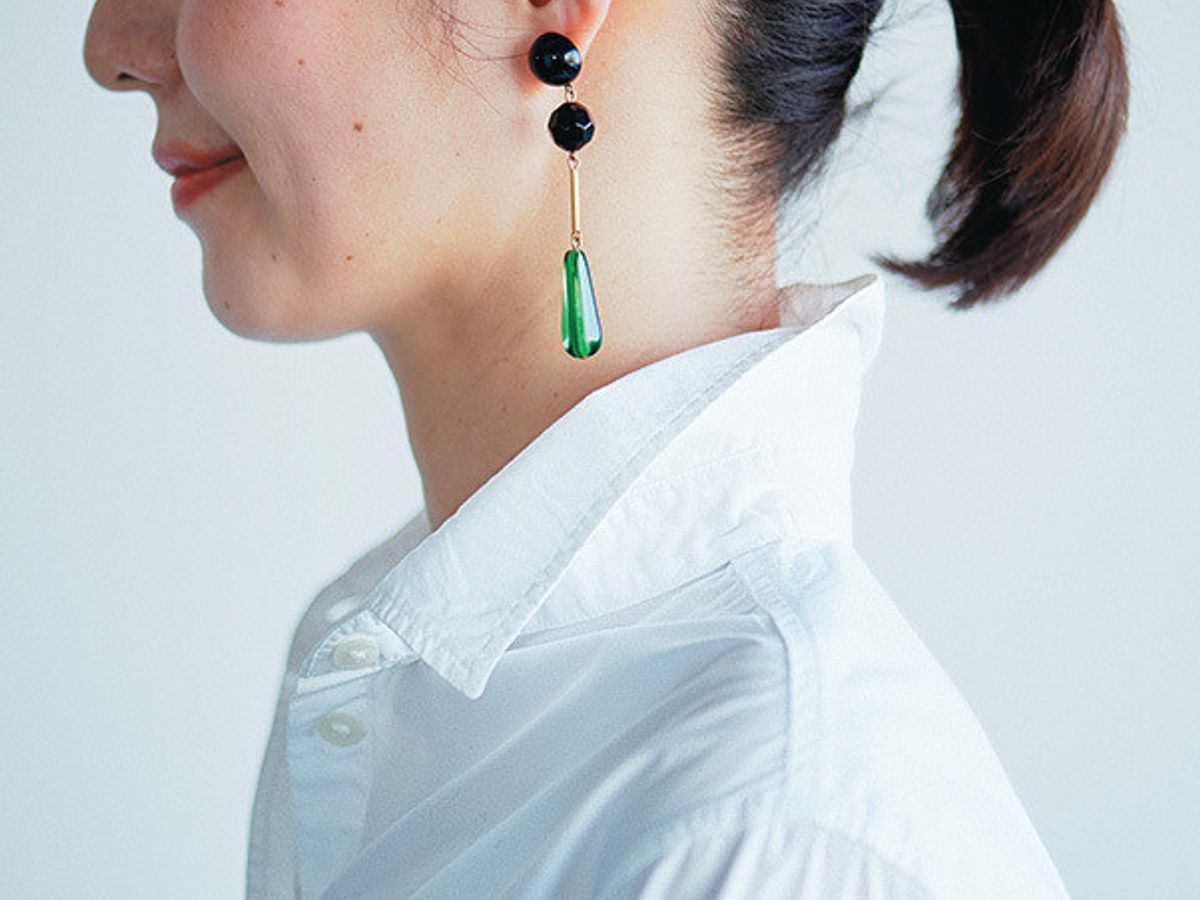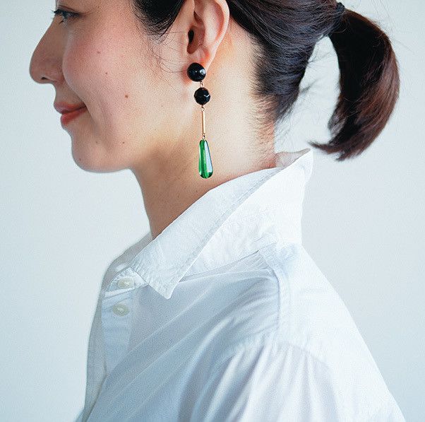 遠目からでもはっきりとわかる存在感のあるアクセサリーをつけて、シンプルなアイテムを格上げするのが30代、40代のシャツスタイルの正攻法。一粒ダイヤのようにさりげなさすぎるものはもう古い