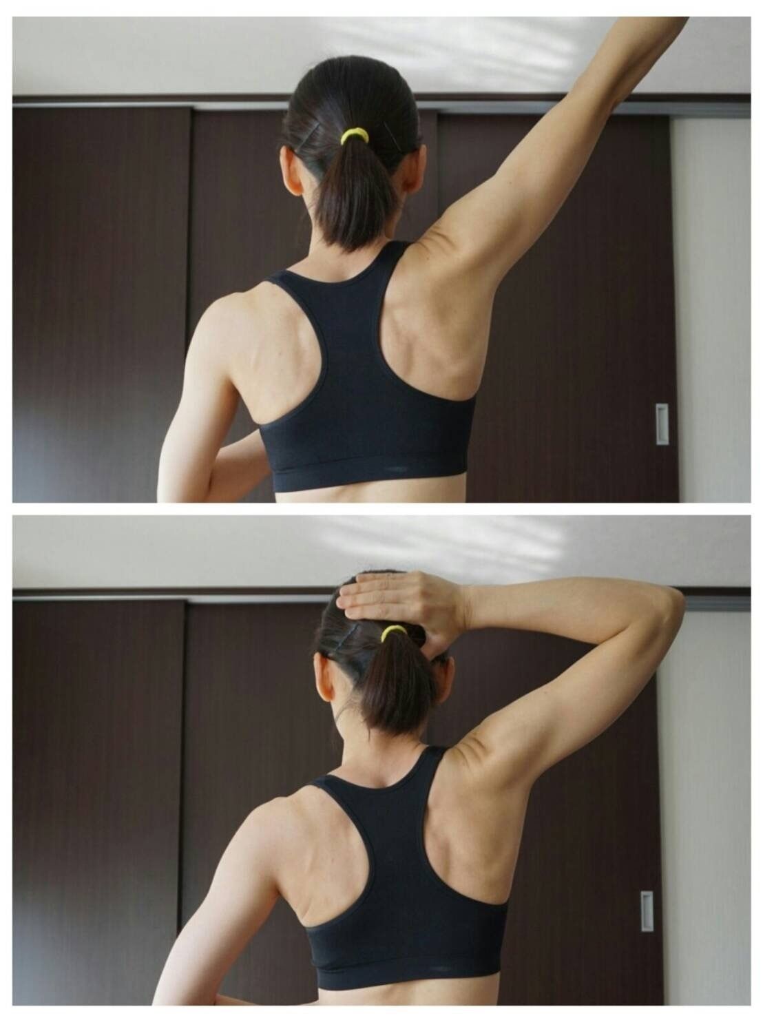 ③ 耳の「後ろ」に腕が付くまで上げます。