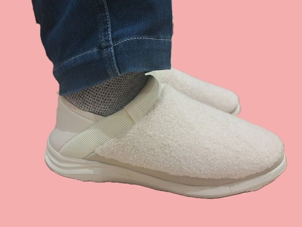 ブラックの方が汚れが目立たずにいいかなとも思ったのですが、最初はヘヤ用のスリッパ感覚で履いて、汚れてきたら外履きにしようと思いました。ということでオフホワイトをチョイスしました。