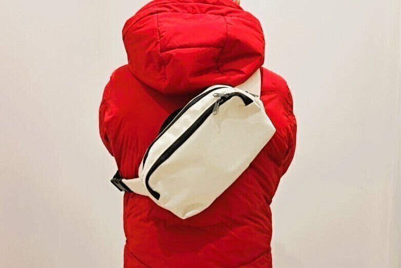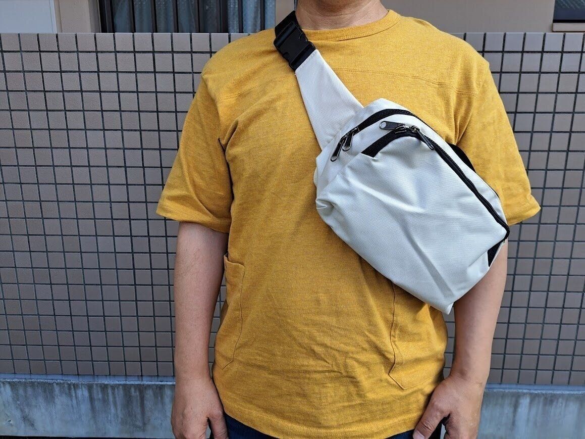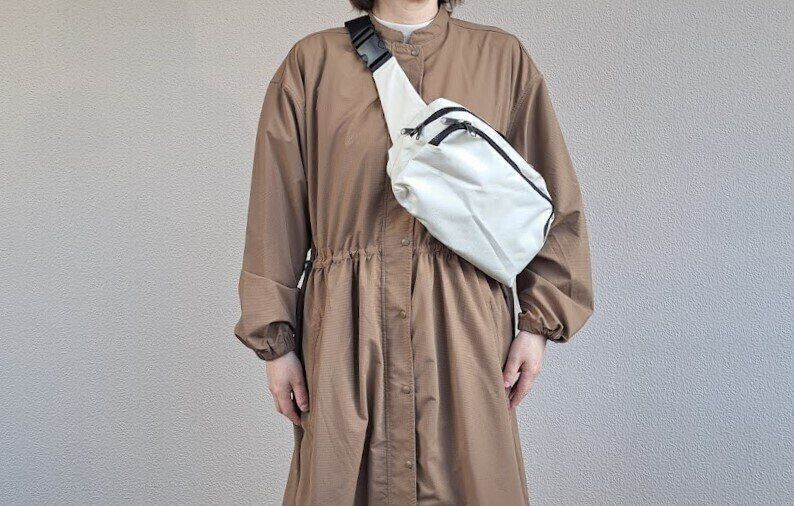 貴重品などを入れる場合は、後ろに背負うのではなく前に持っていたほうが気持ち的にも安心なので、この手のサイズ感は、前持ちできるのがうれしいです。もちろん背中に背負ってもいい感じです。