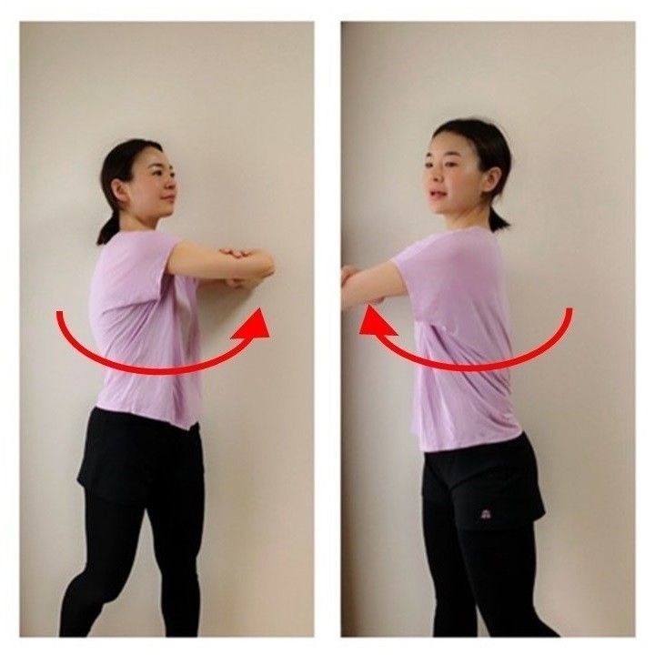 ひじをつかみ、右左のひじで8の字を描くように、体を回します。呼吸をしながら3回。