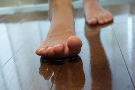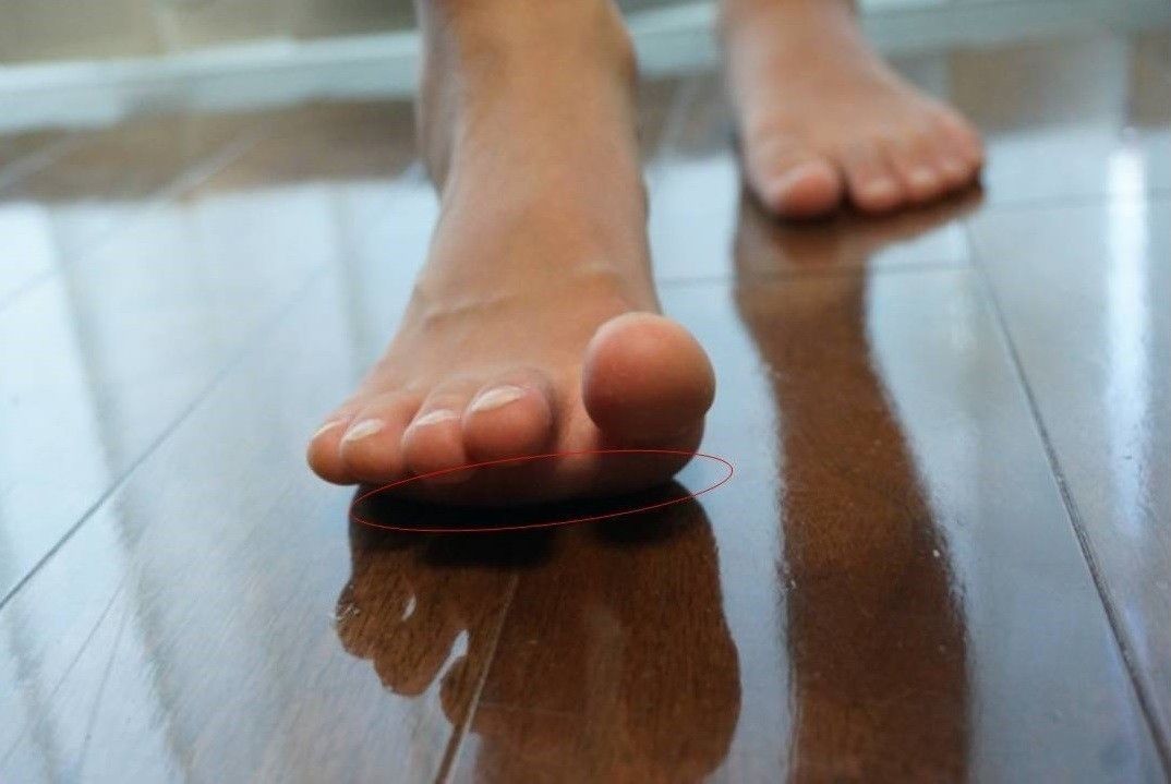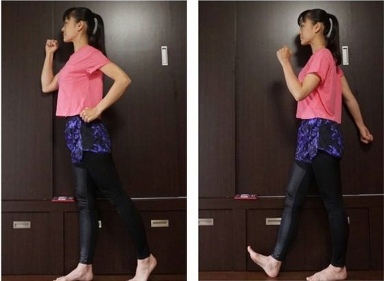 ① 踵をつけたまま、前にした方のつま先を上げる。