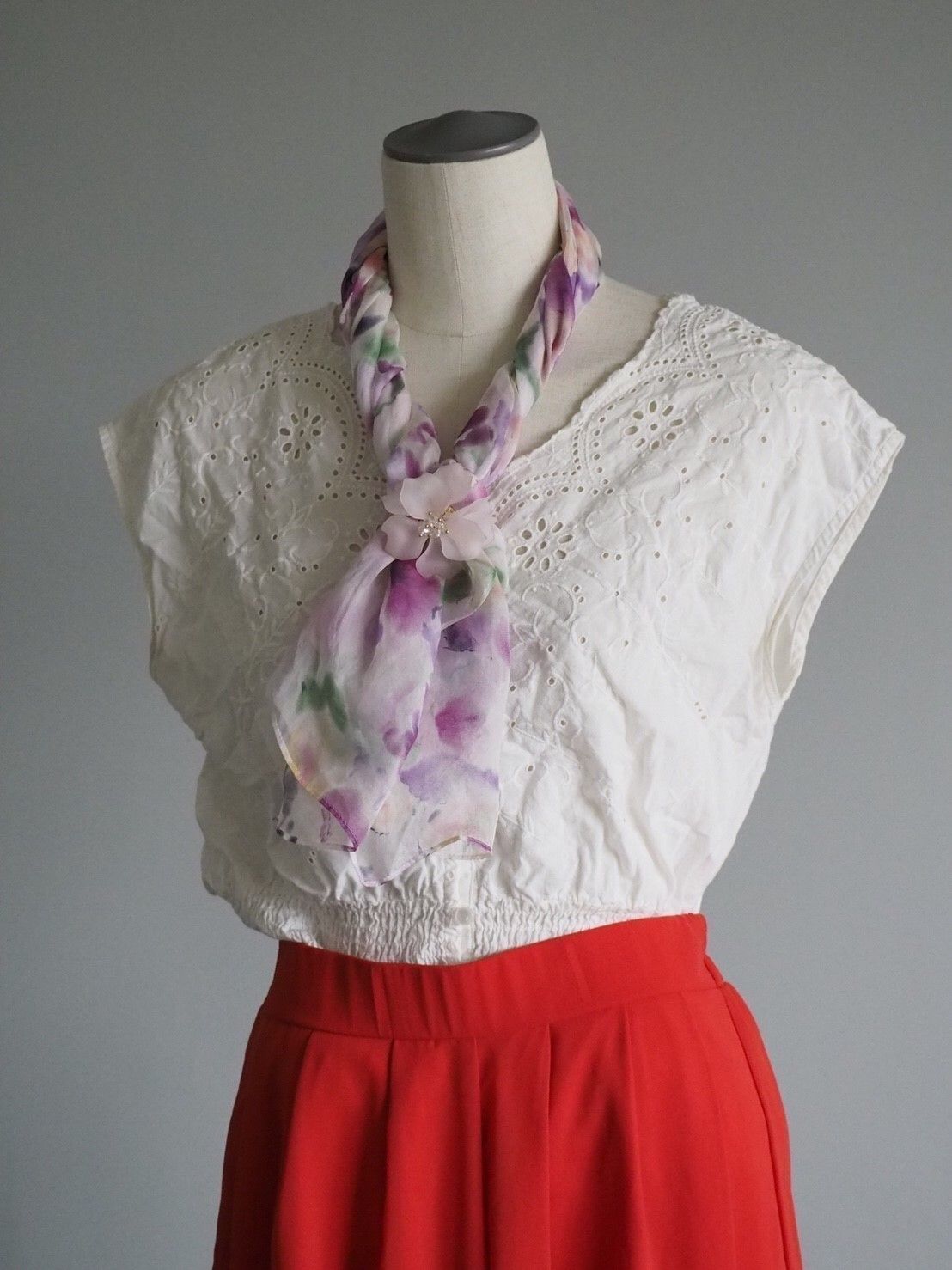 ねじるので厚い季節でも首元がすっきりし、日焼けが気になる首の後ろや胸元の開きもカバーできます。また同じアレンジでも素材で見た目も変わります。これからの季節は洗える綿素材やリネン(麻)もおすすめ。色々試してみてください。