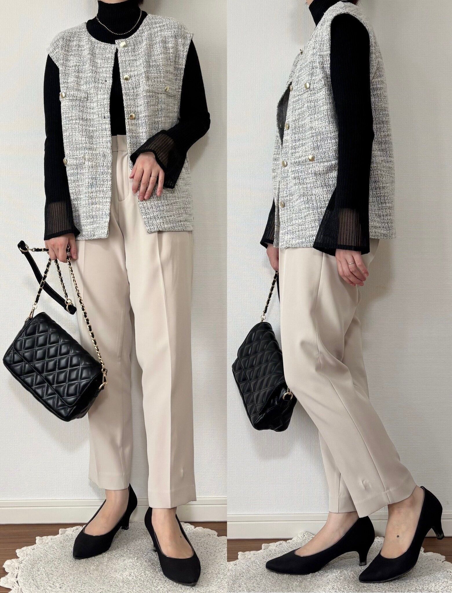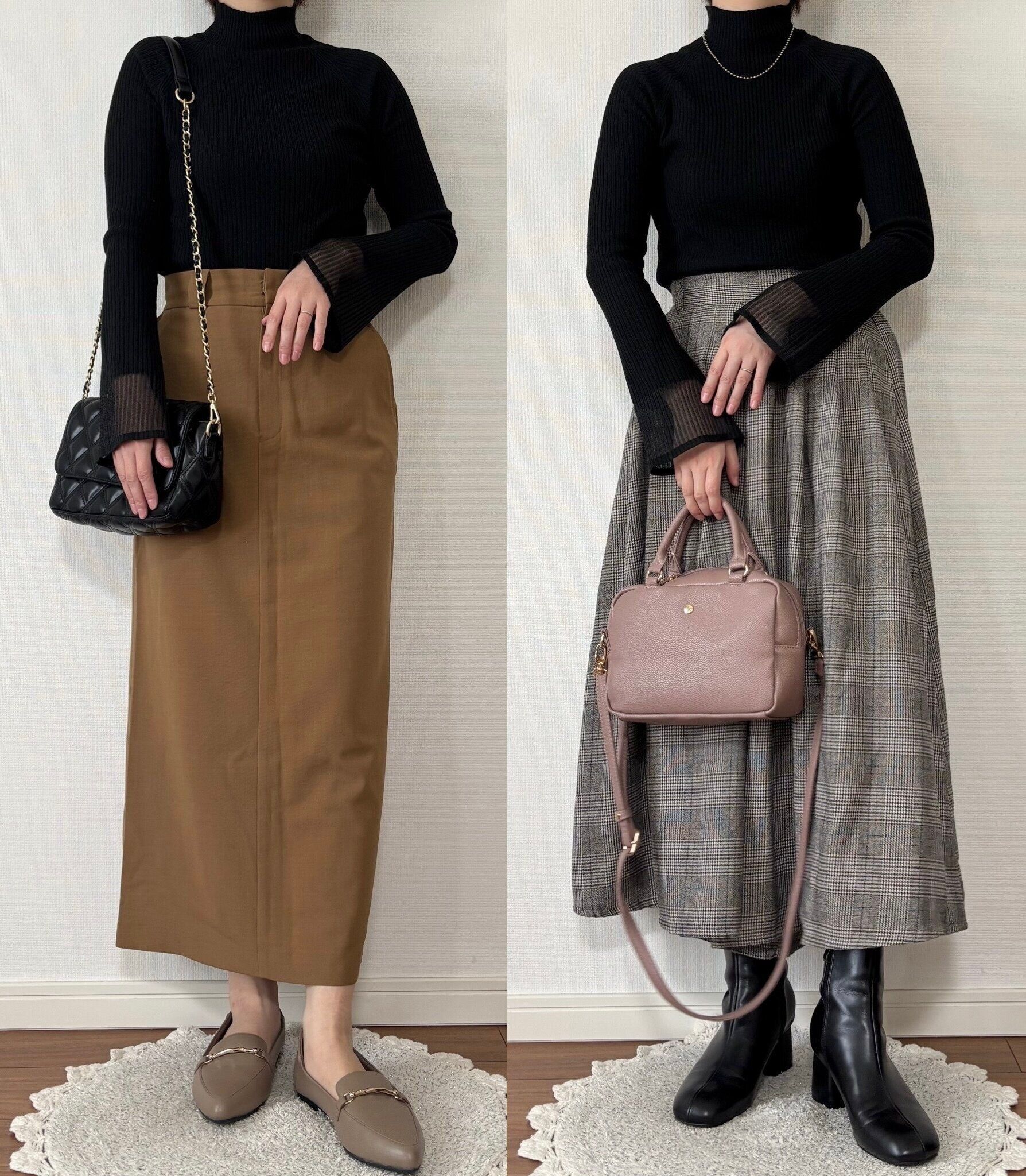 まだ肌寒い春先にも着ることができそうな厚みのニットなので、シャツの中にハイネックを合わせるトレンドコーデもすっきりと決まります。