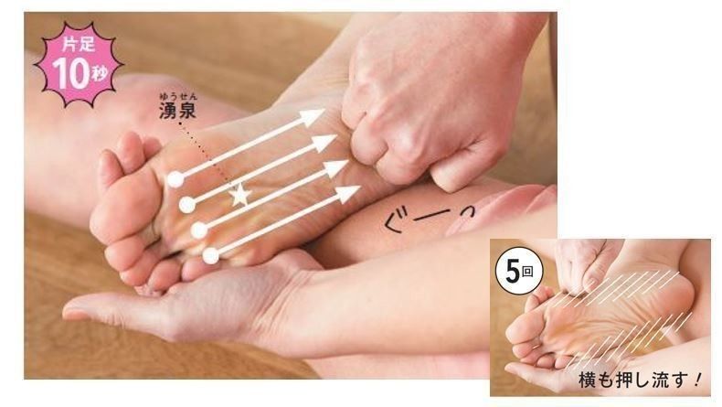 片手を握り、第2関節を足の裏の指の根元に強く押し当てる。かかとに向かって、足裏全体を強くこする。デトックス効果がある湧泉も同時に刺激。足裏の左右の縁までしっかり刺激。