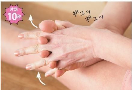 右足の指の間に左手の指を差し込む。互いの指の根元が合わさるまで深く指を組んだら、手の指で足指を「ギュッギュッギュッ」と、強く握って刺激。