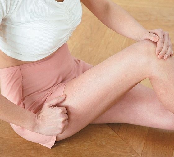 右手を握り第2関節を太ももの外側に当てる。ひざ上から脚のつけ根に向かって手の位置をずらしながら「グッグッグッ」と強く刺激。外側、内側、裏側と全体的に。