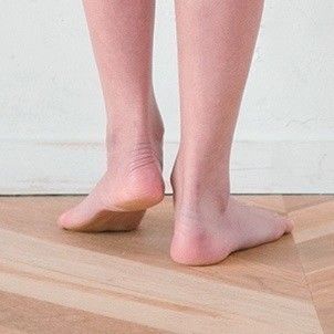 両足をそろえて立ち、両手で腰の左右を軽くつかむ。腰から引き上げるように左足のかかとをできるだけ高く上げて下ろす。右足も同様に行い、左右交互に続けて。