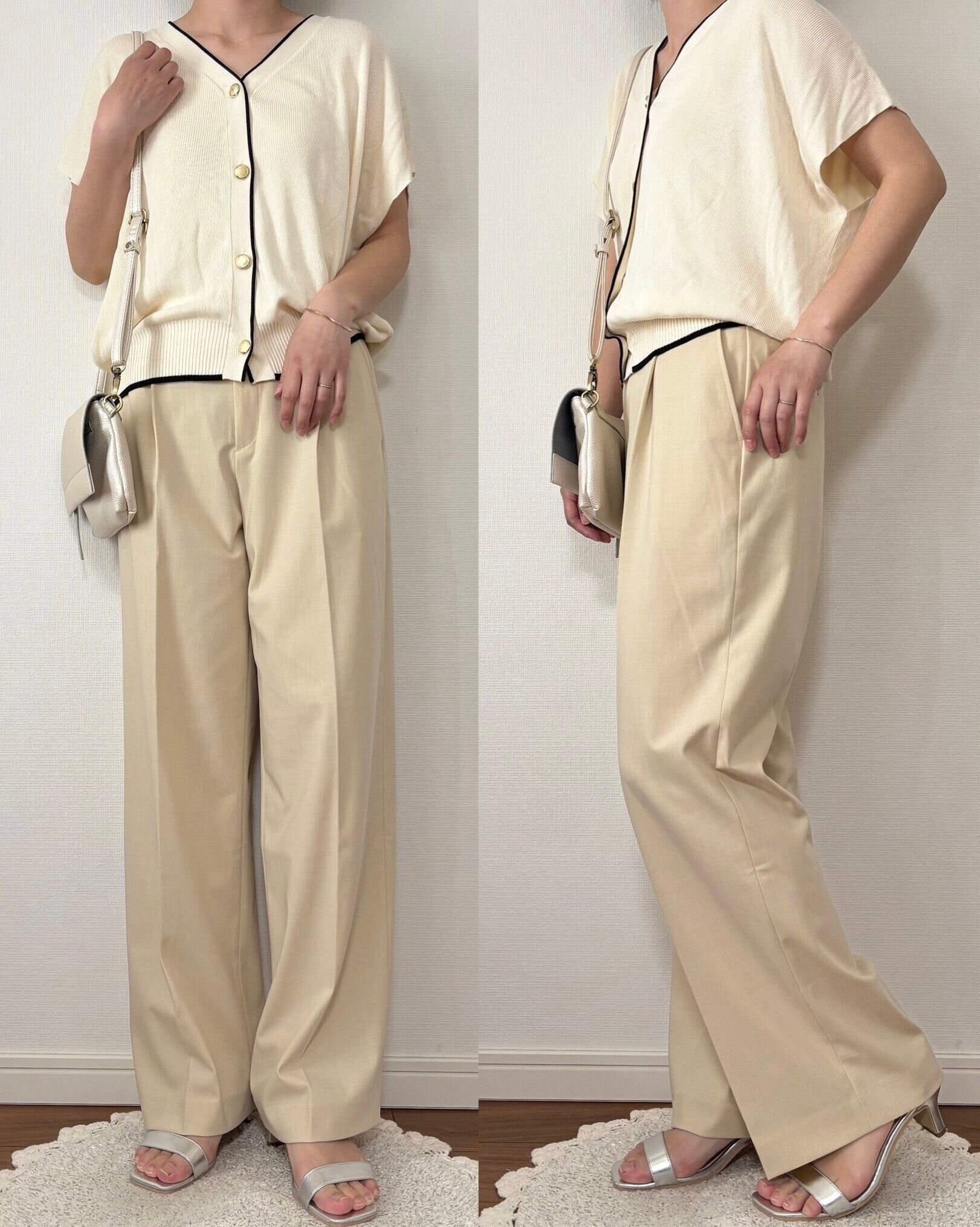 ニット素材でありながら柔らかくさらっとしたゆとりのある着心地で、汗染みの心配もしなくてすみそうです。インナーはキャミソール1枚でも露出度を抑えつつ涼やかな大人コーデの完成。