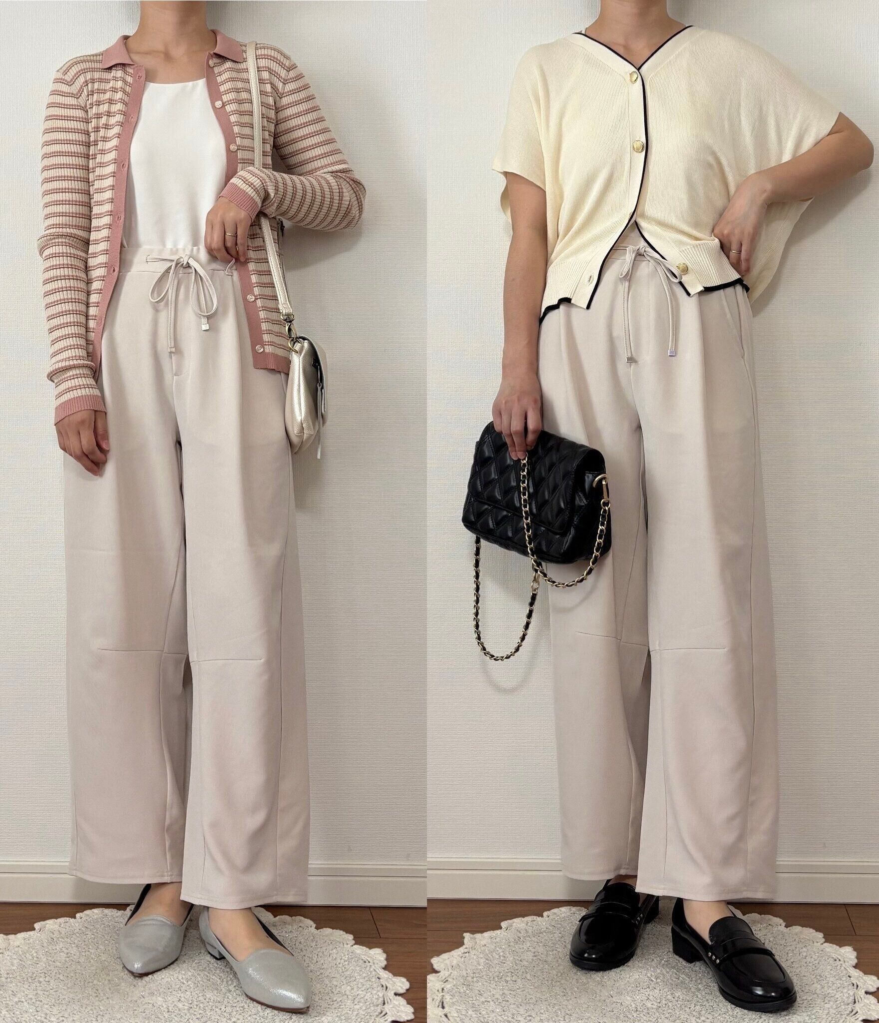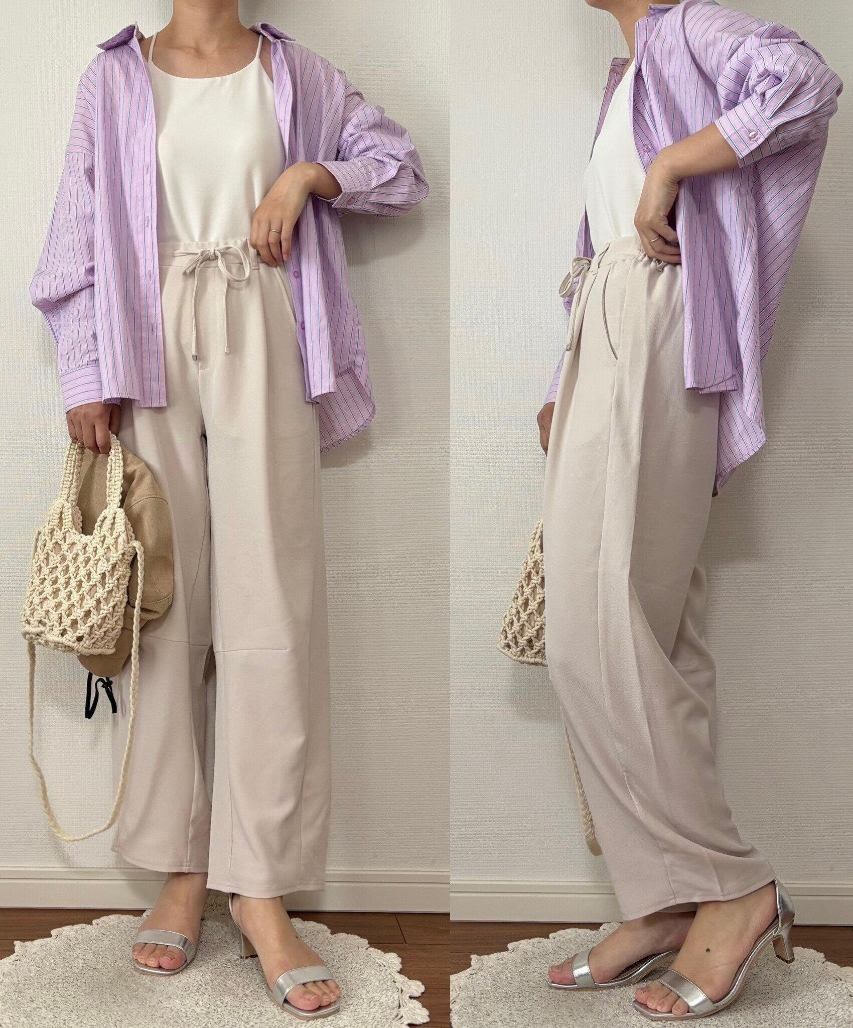 ウエストのドローストリングはカジュアルな印象があるので、ピンクなどの甘めアイテムや綺麗めなトップスのハズしとしても活躍します。