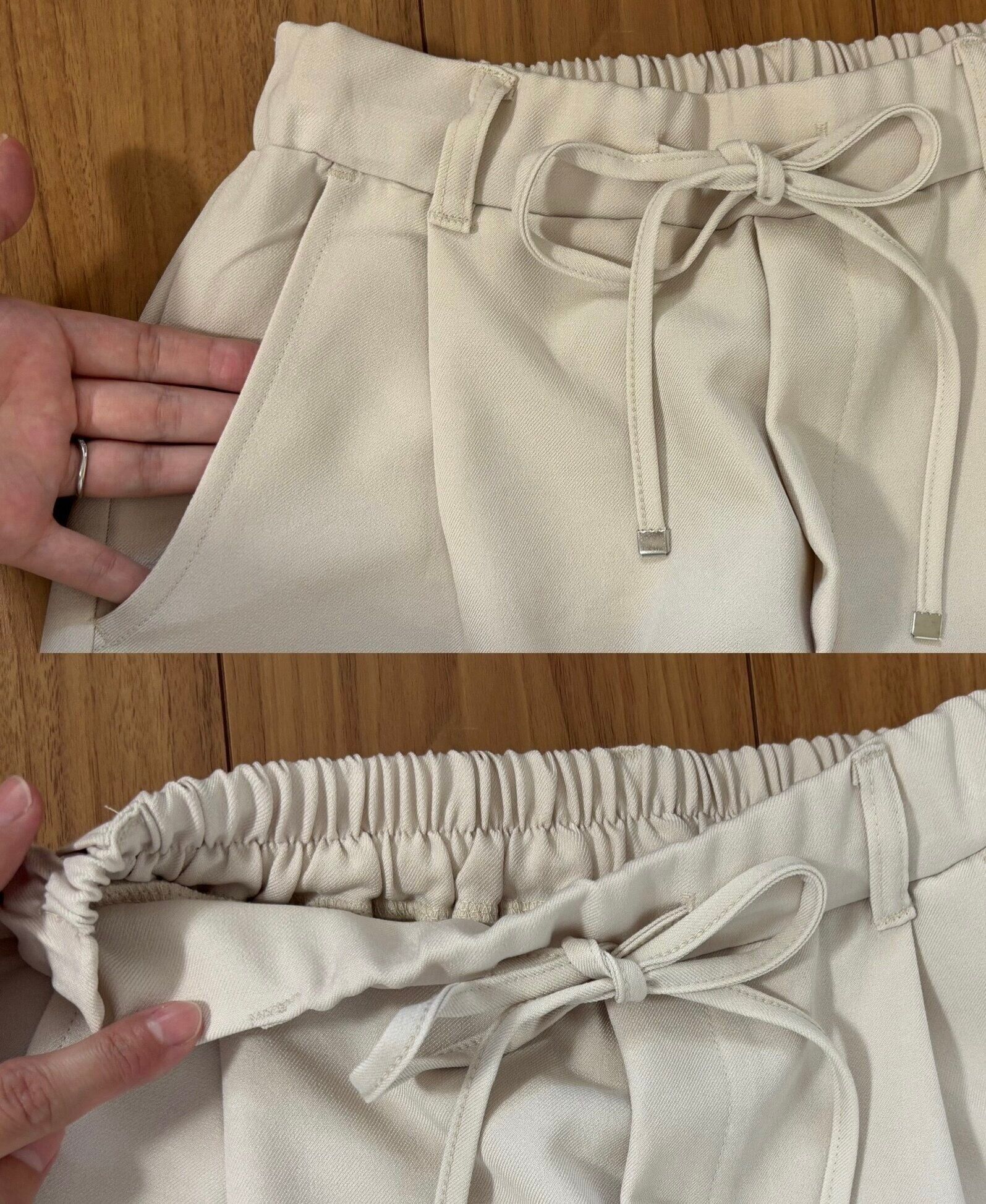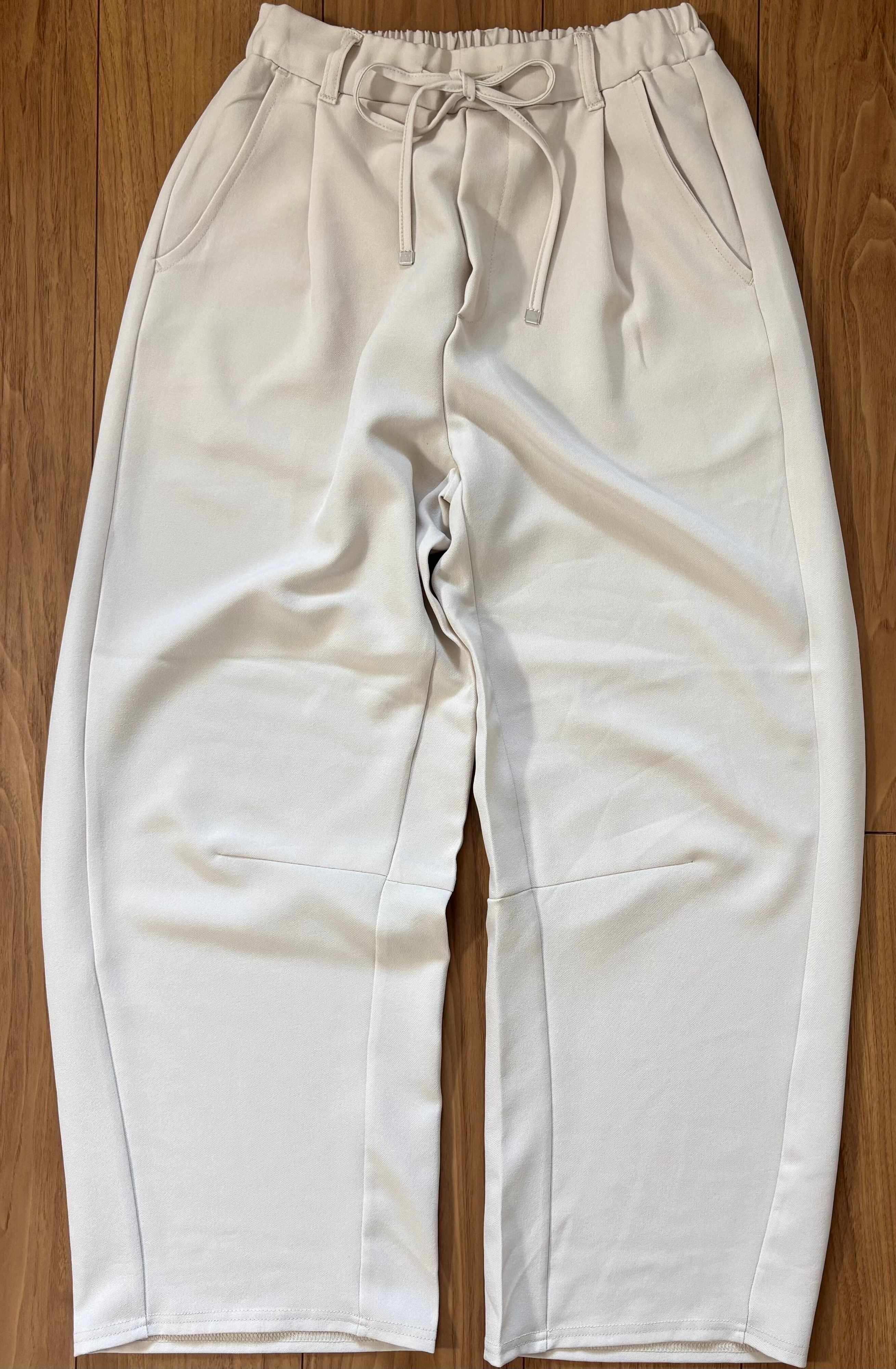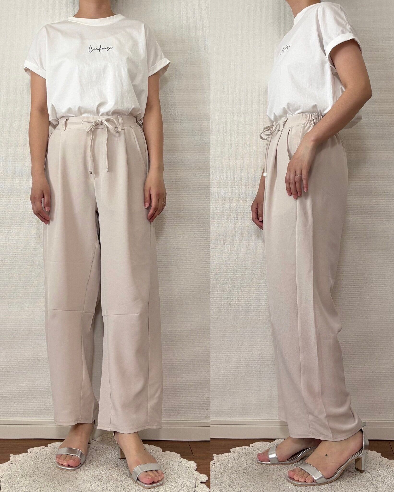 リラックスして履けるウエストドローストリング。ホワイトに近い淡いグレーがおしゃれなパンツです。