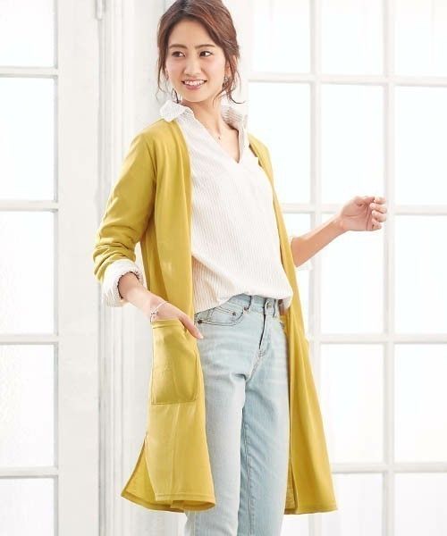 コクーンシルエットが人気、ADAM ET ROPE'のライトイエローのカーディガン。ぱっと目を引く明るいイエローは、ペールトーンなのでオフィスでも浮かず、華やかさを与えてくれます。
