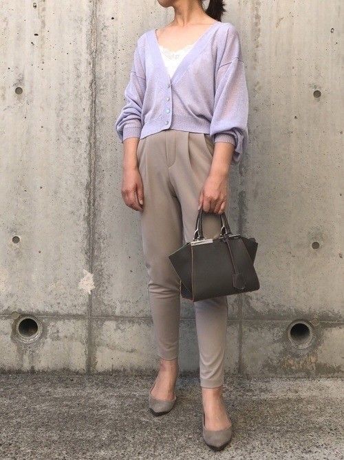 女性らしさも感じさせるライトパープルは、オフィスにもぴったりの万能カラー。ゆとりのあるつくりのclearのカーディガンに、ペールトーンのボトムスを合わせて優しい印象に。