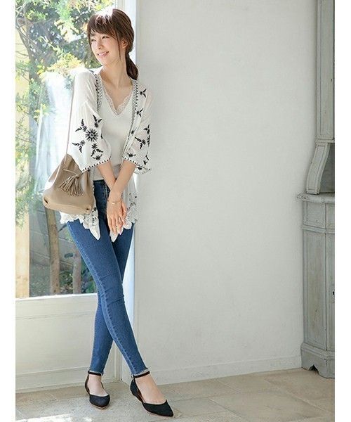 オシャレ上級者におすすめのアイテムが、レースや刺繍など華やかなデザインのガウン。さらっと羽織るだけでいつものオフィスコーデがワンランクアップしますよ。
