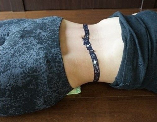 2の状態は、ムダ肉が正しい位置に収納された状態。この姿勢で、おへそを通るようにマスキングテープをぐるっと一周巻きます。