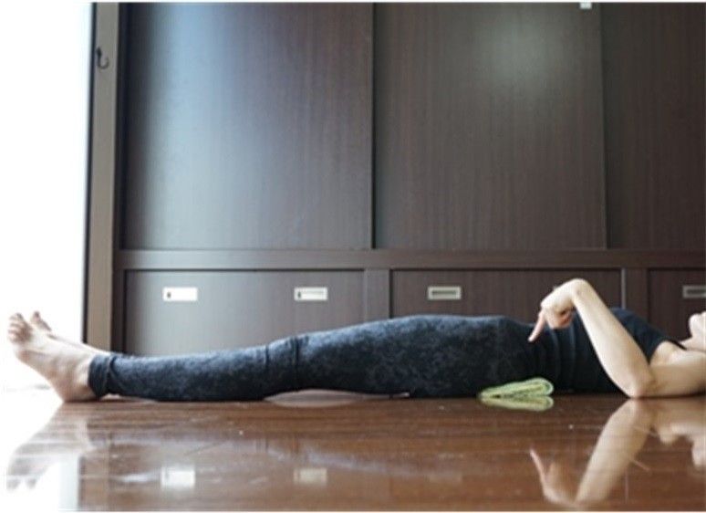 「2、仙骨の下にタオルを入れる 仙骨はウエストのくびれから指4本分下にある、骨盤の一番大きい骨の部分。その真下にタオルを敷き、左右の仙骨の高さを揃えます。」