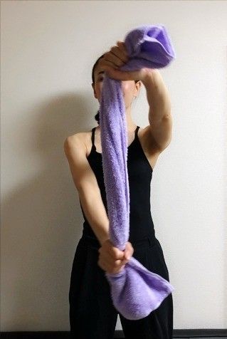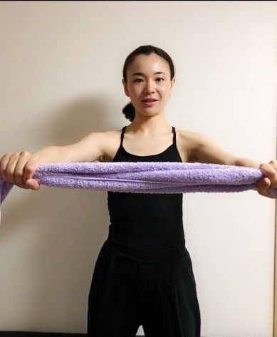 タオルを首にかけてはじを持ち、肘をゆっくり開き、次にゆっくり閉じます。