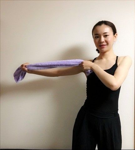 タオルを横に持ちます。右手でタオルを右側にひっぱります。しっかり伸びきったら、タオルを伸ばしたまま正面を通過して、左手でタオルをしっかり伸ばします。