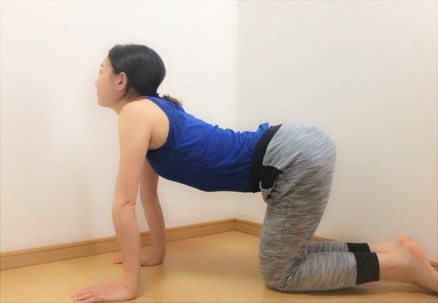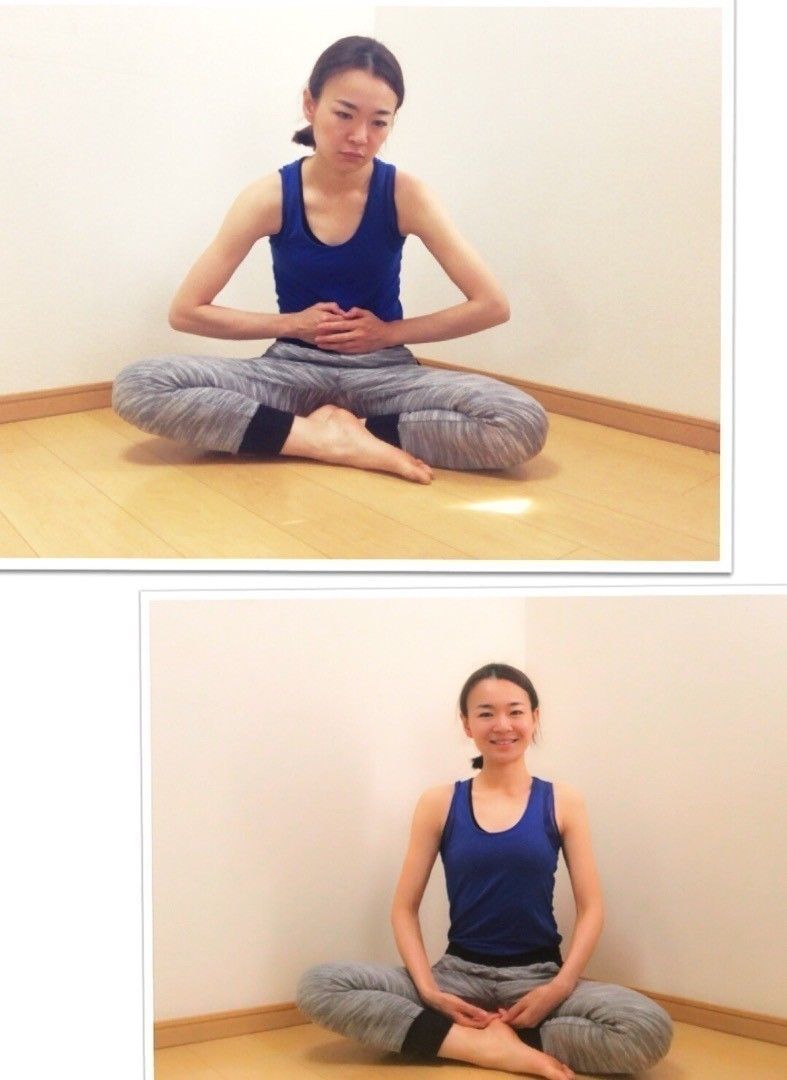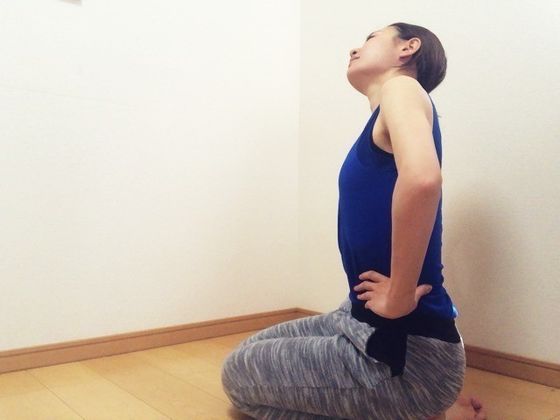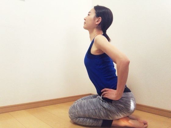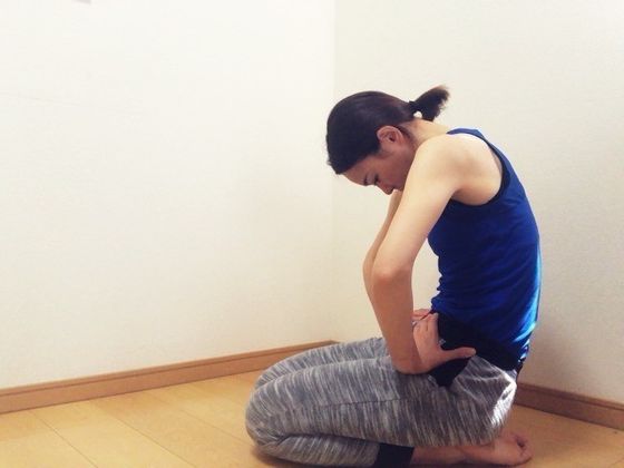 腰を下ろして、両膝を軽く開き、手をつきます。