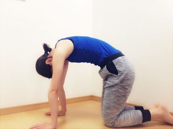 しっかりそらせたら、次にゆっくりとおへそをのぞくように、背中を丸めます。