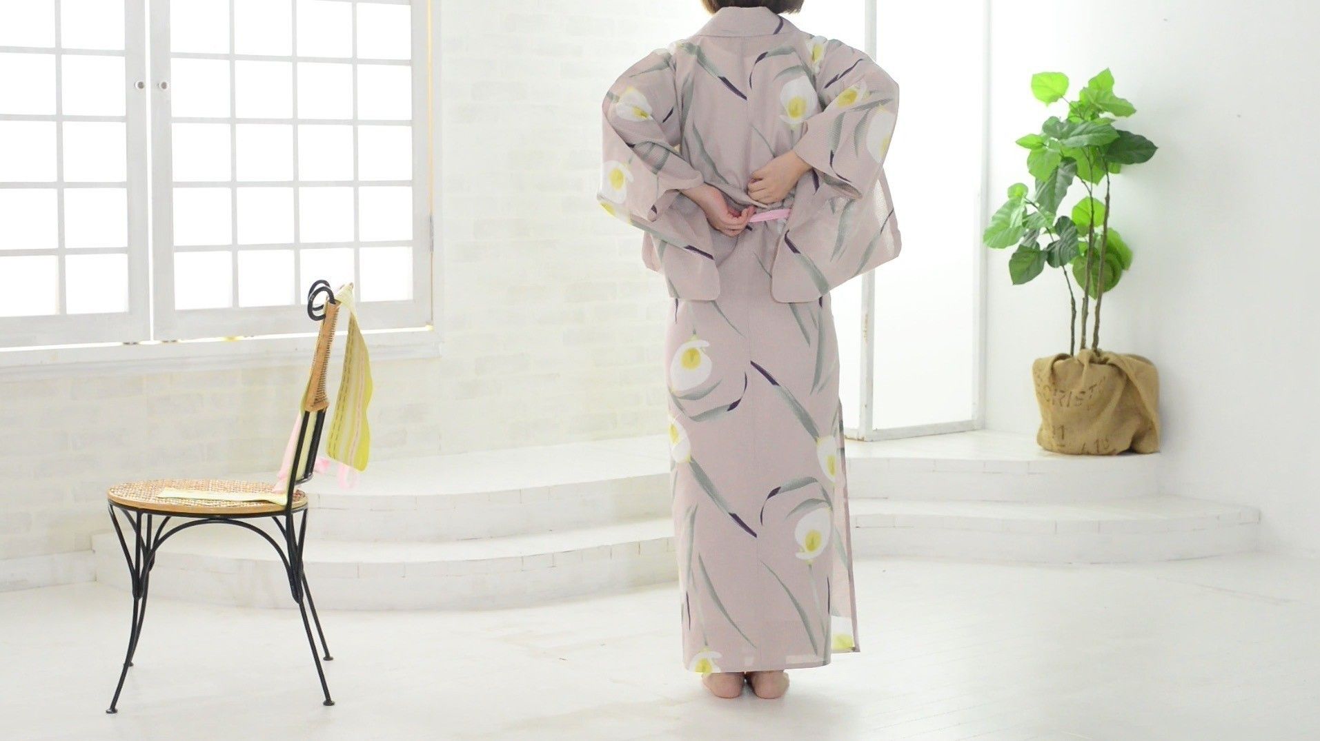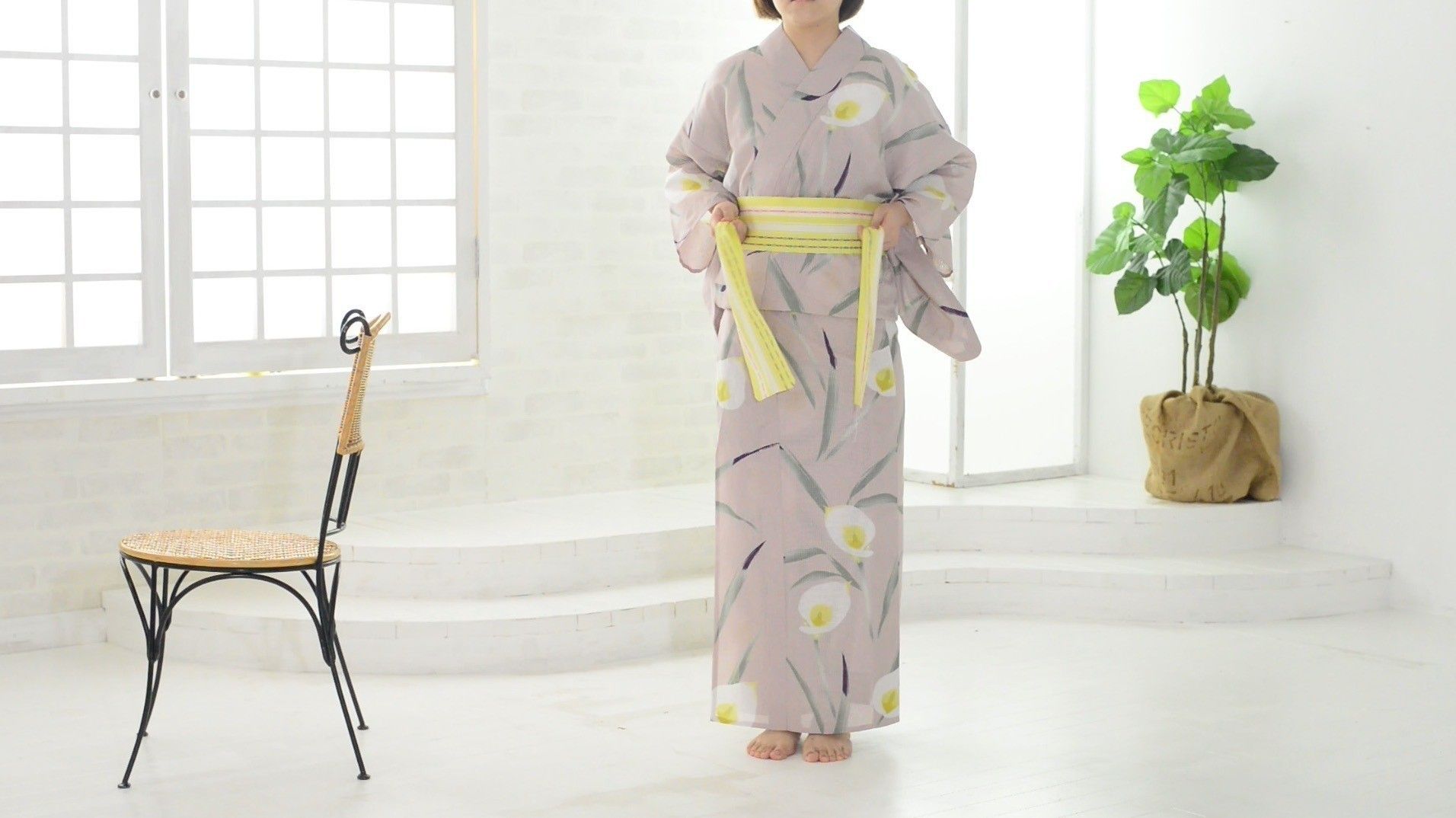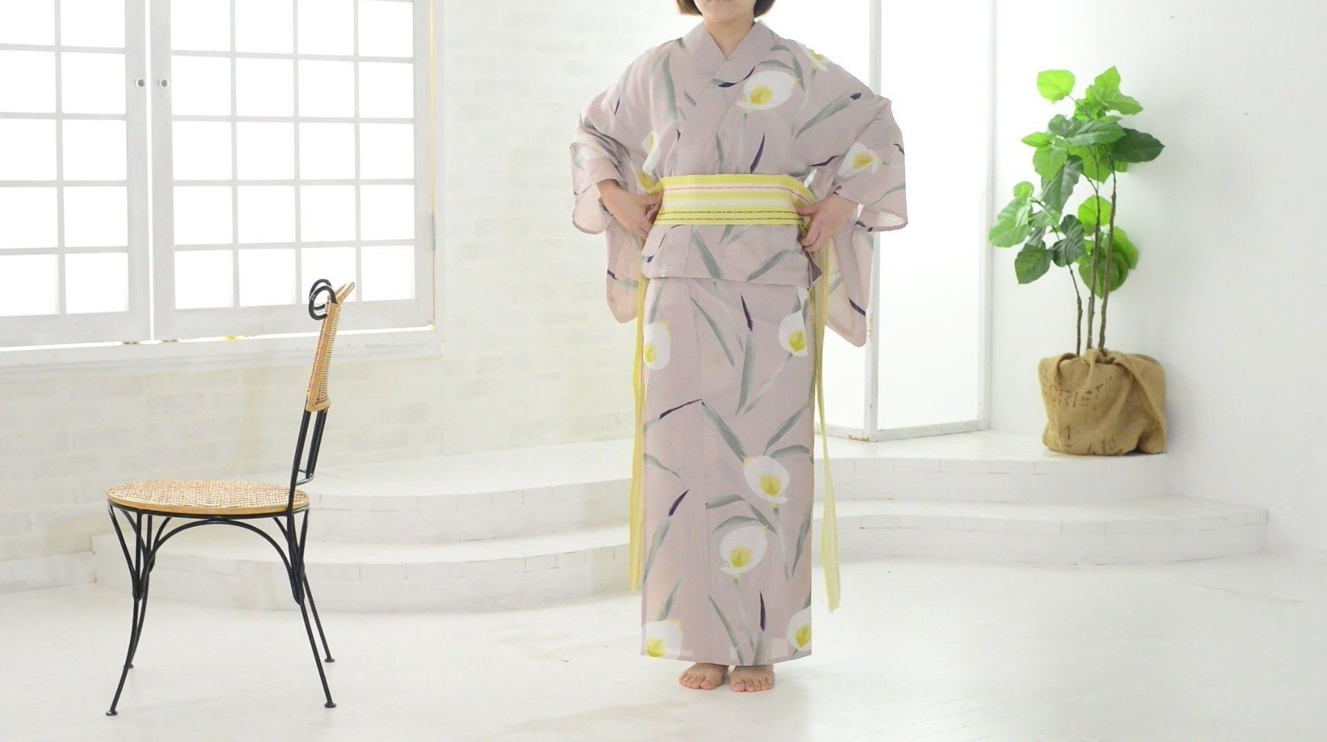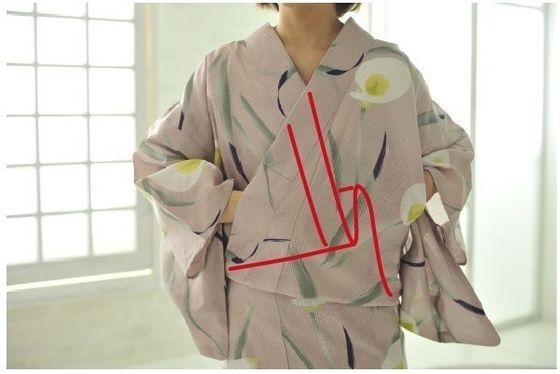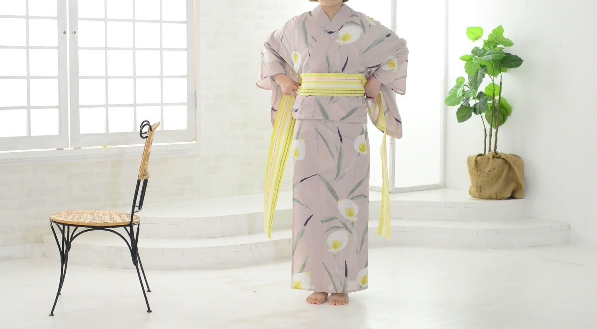 浴衣をきれいに着付けるポイントは、前のおはしょりをすっきり整えること。おはしょりのだぶつきが気になるときは、下前を斜めに折り上げることで、生地の重なりがなくなり、すっきり着られますよ。