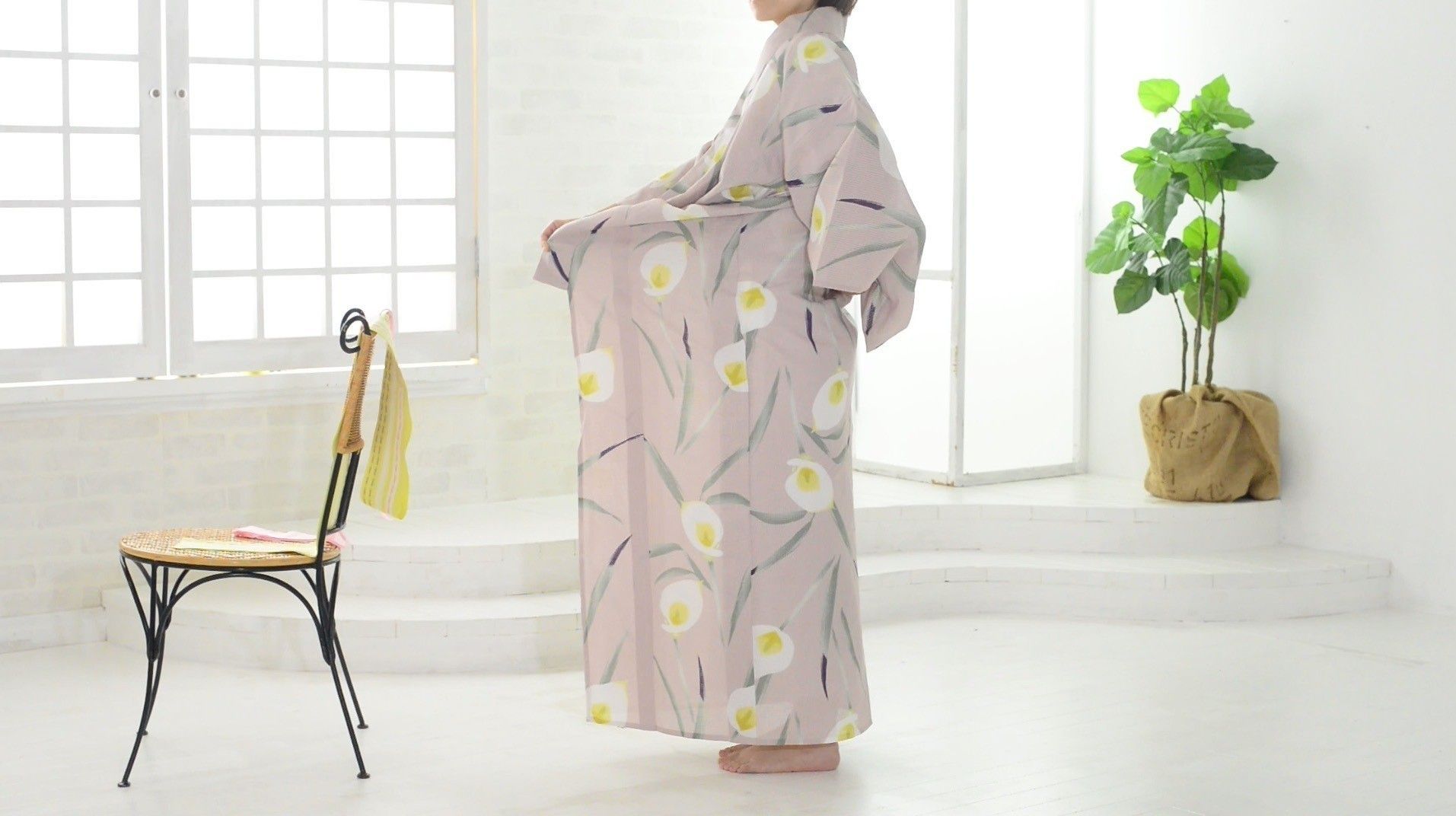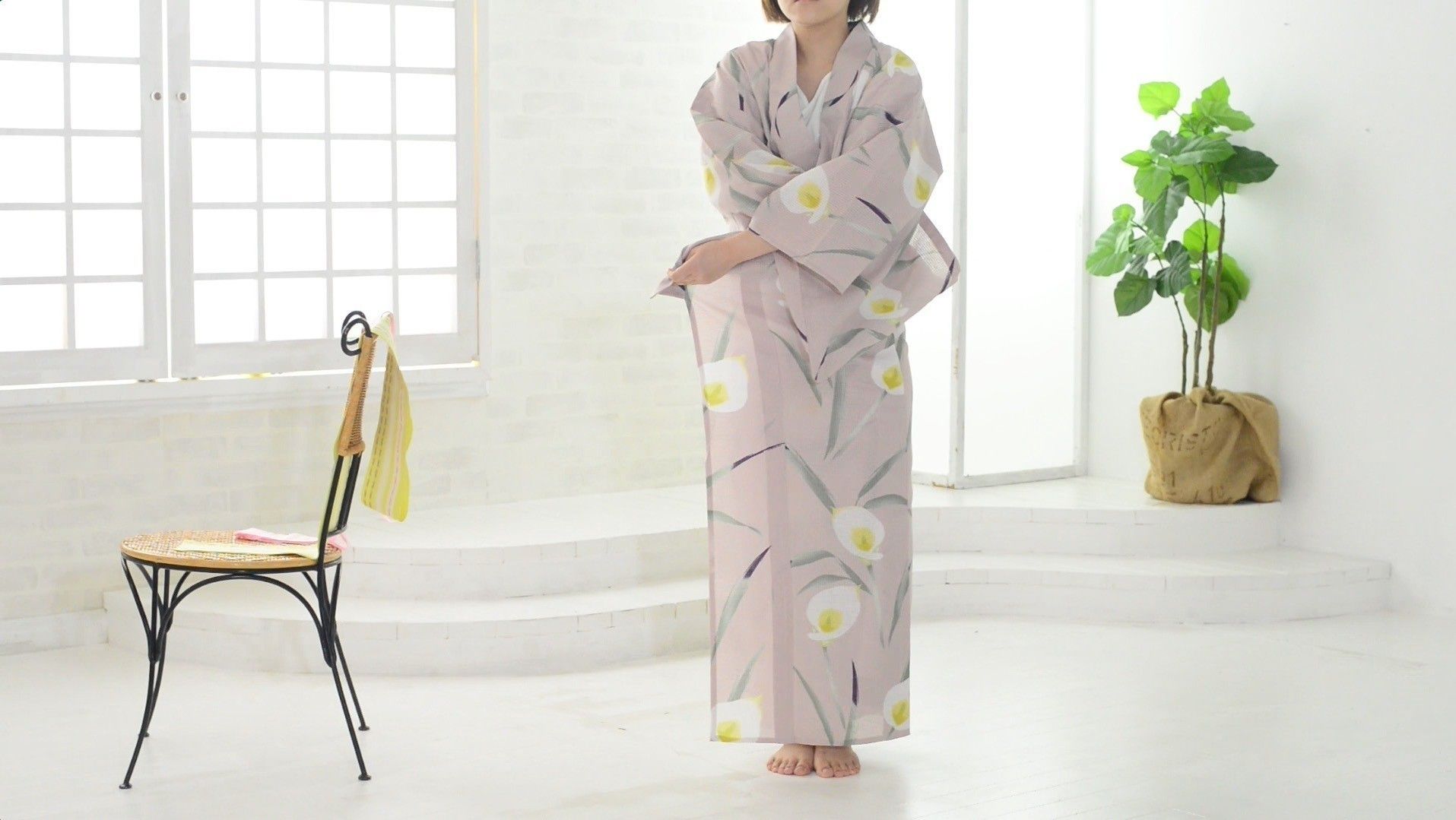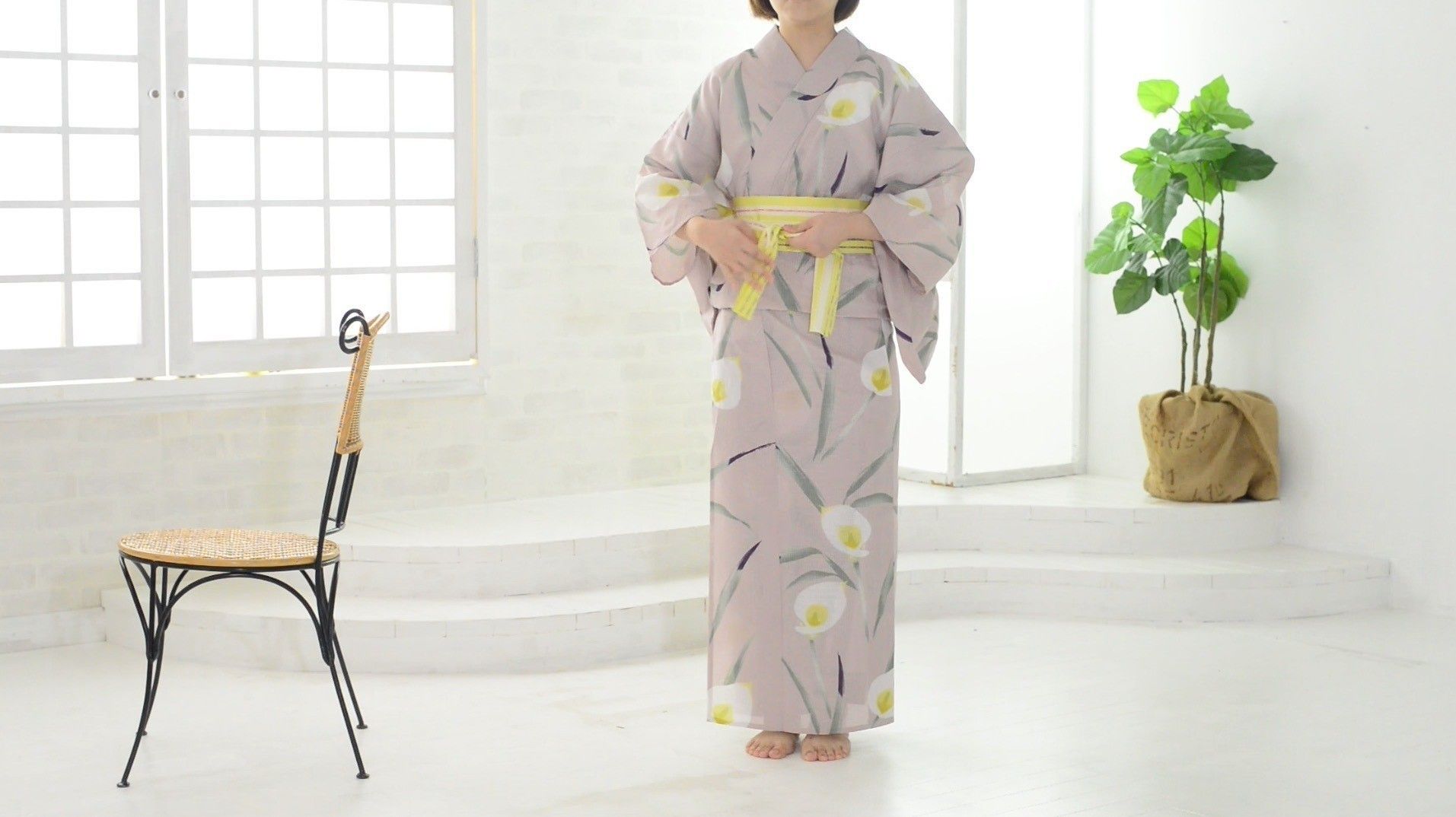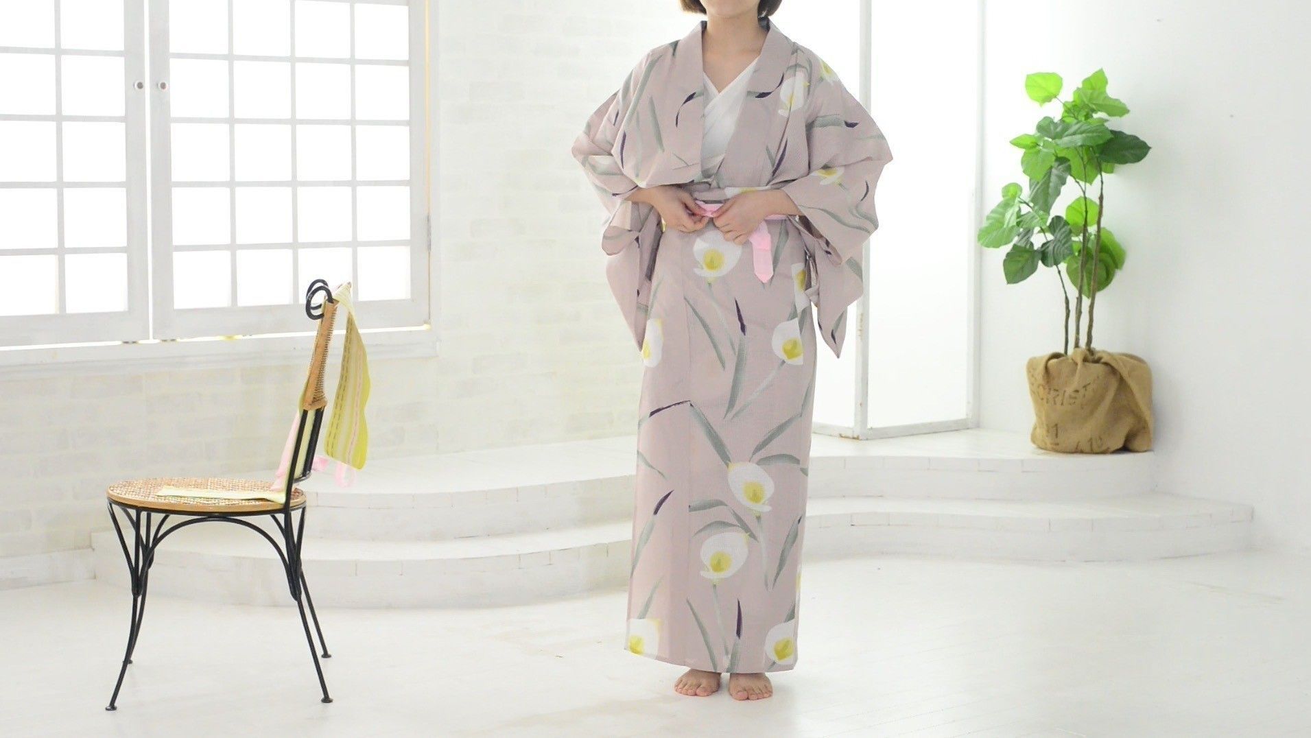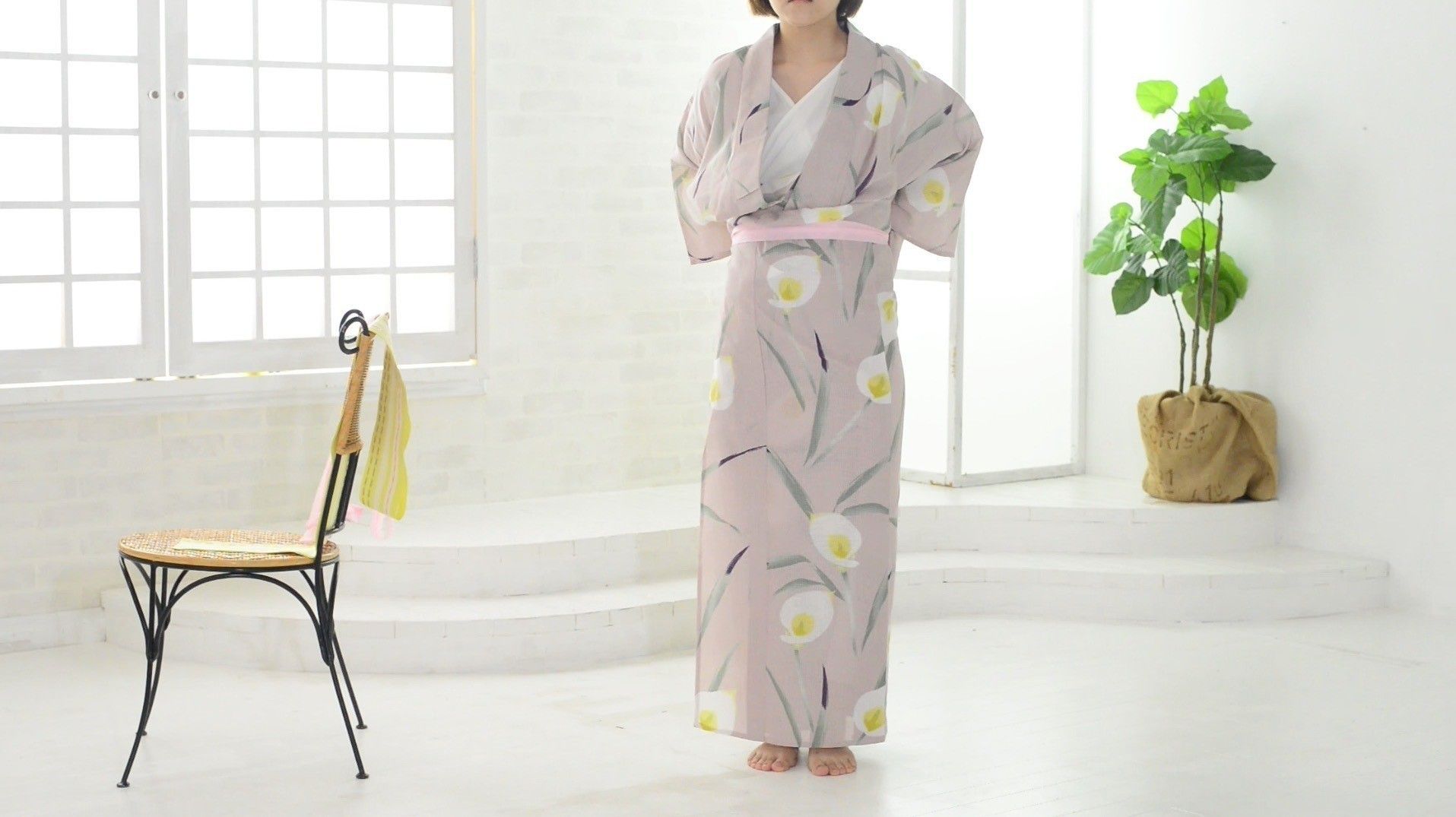 浴衣をきれいに着付けるポイントは、前のおはしょりをすっきり整えること。おはしょりのだぶつきが気になるときは、下前を斜めに折り上げることで、生地の重なりがなくなり、すっきり着られますよ。