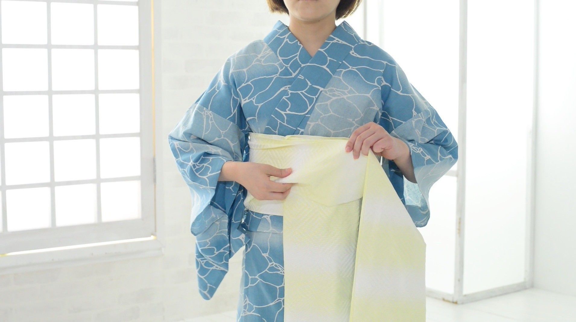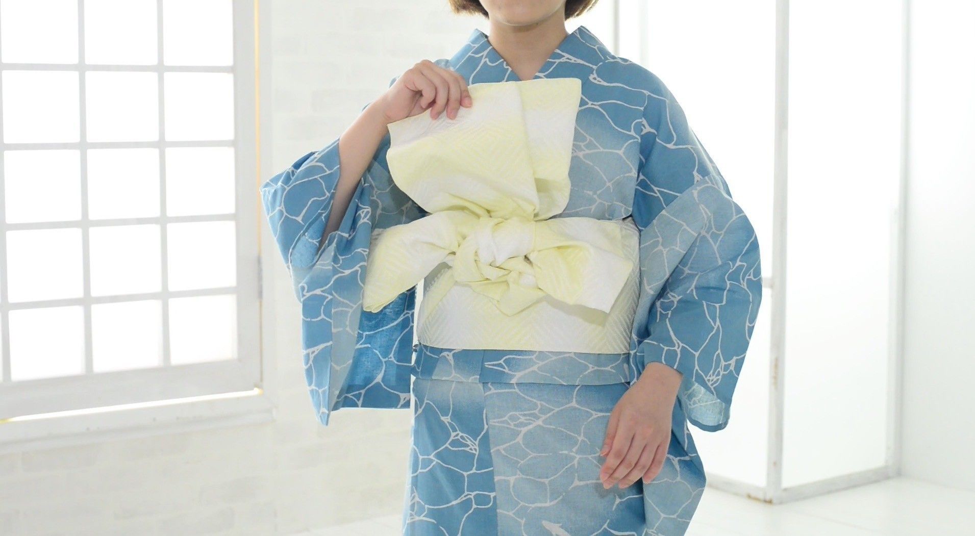 帯は、体に巻き始める方の端から数十センチを「て」、体に巻いた後の羽根を作る部分を「たれ」と呼びます。浴衣の帯結びでよく使われる半幅帯や兵児帯には、「て」と「たれ」の区別がなく、どちらから結んでもOK。ただ、一度結ぶと帯に折り線がつくので、どちらか片方を「て」と決めておくのがおすすめです。