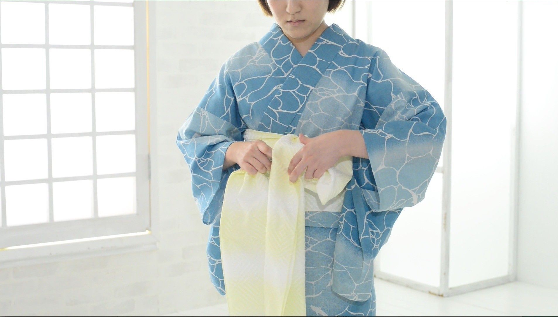 「て先」を床につくくらい長めにとり、後ろから帯を巻きつけます