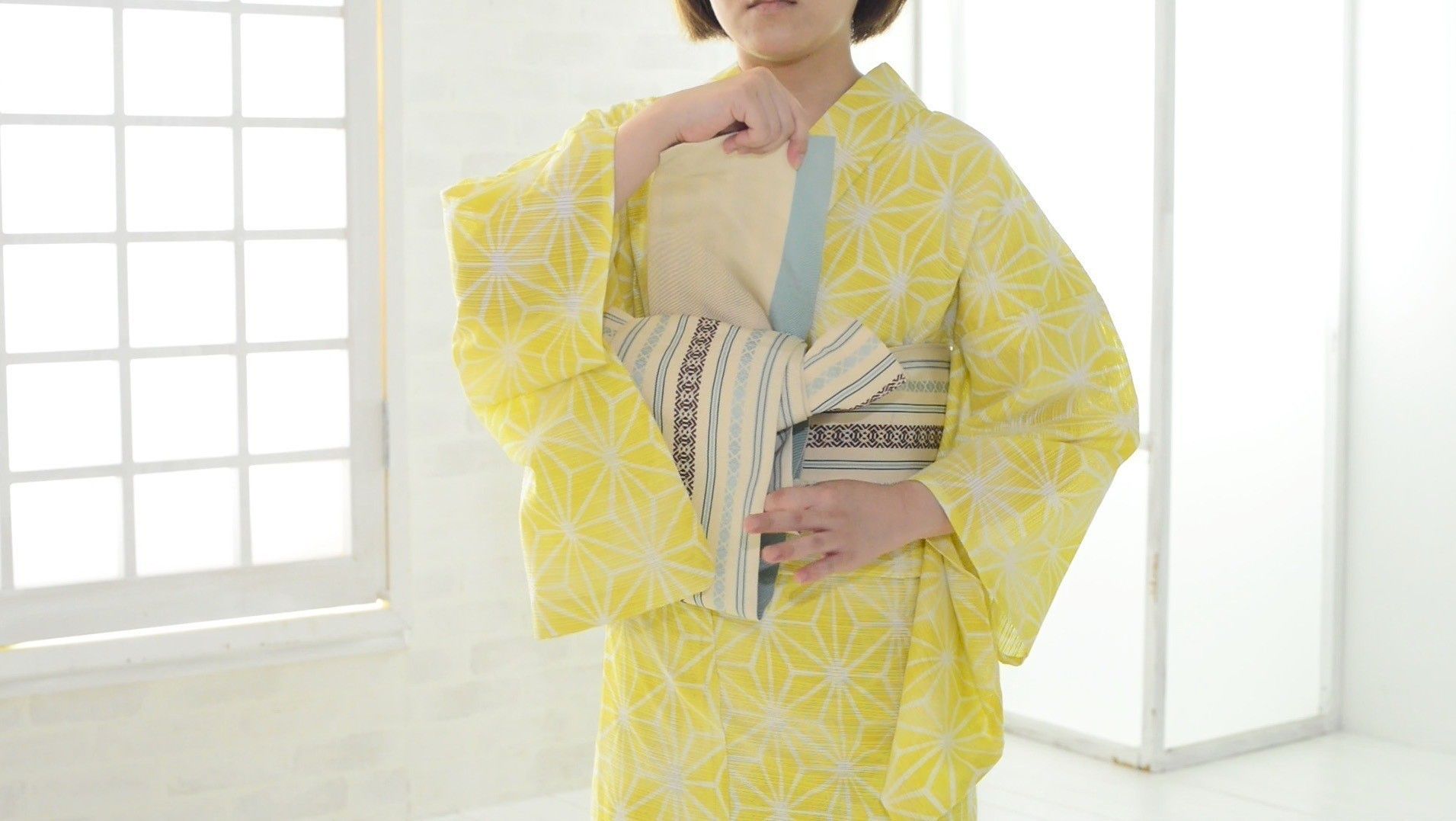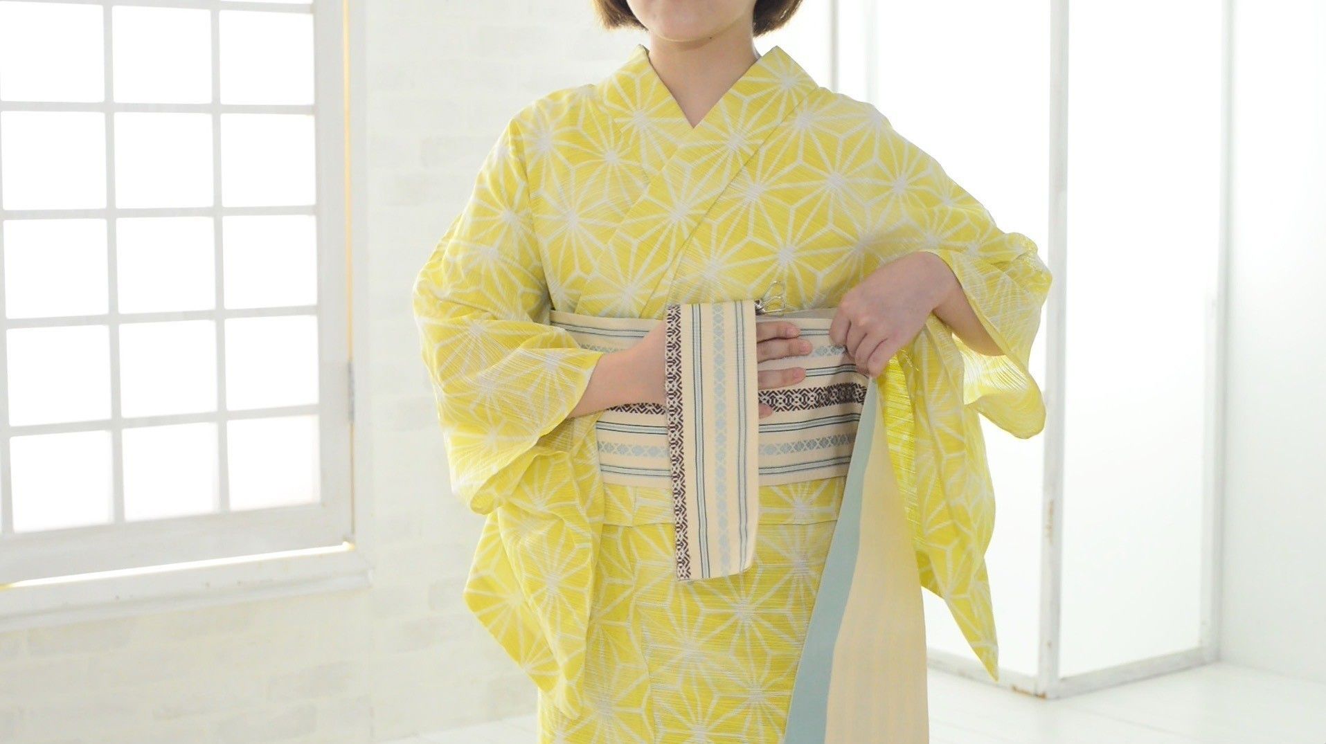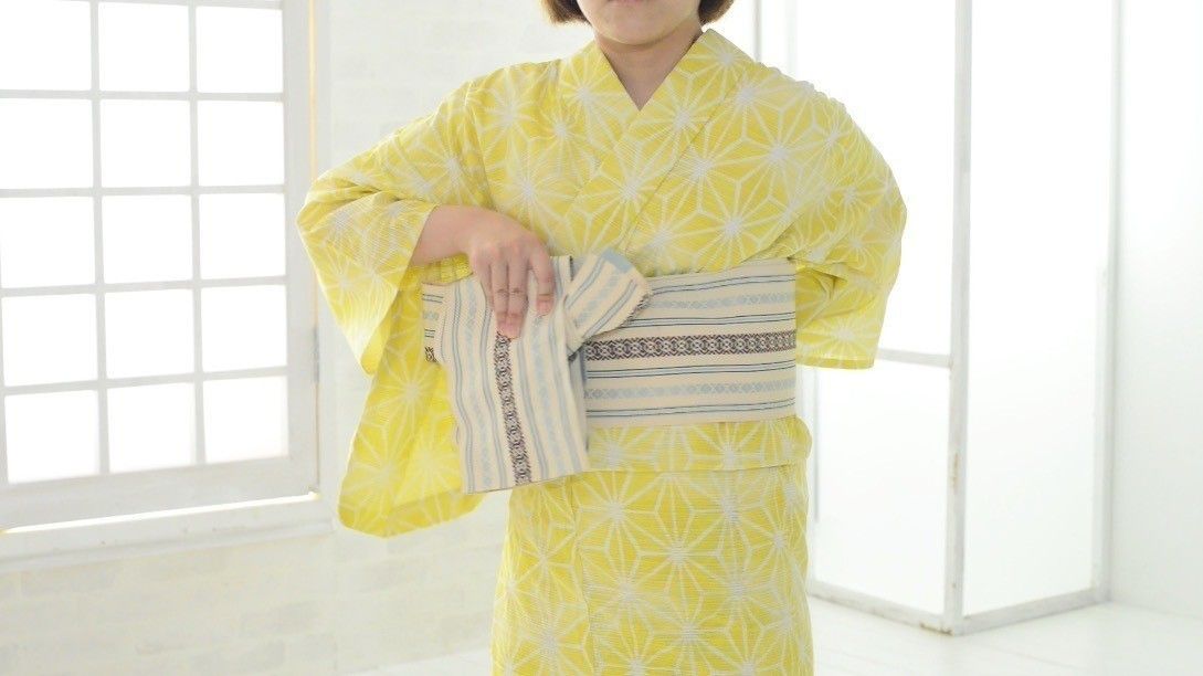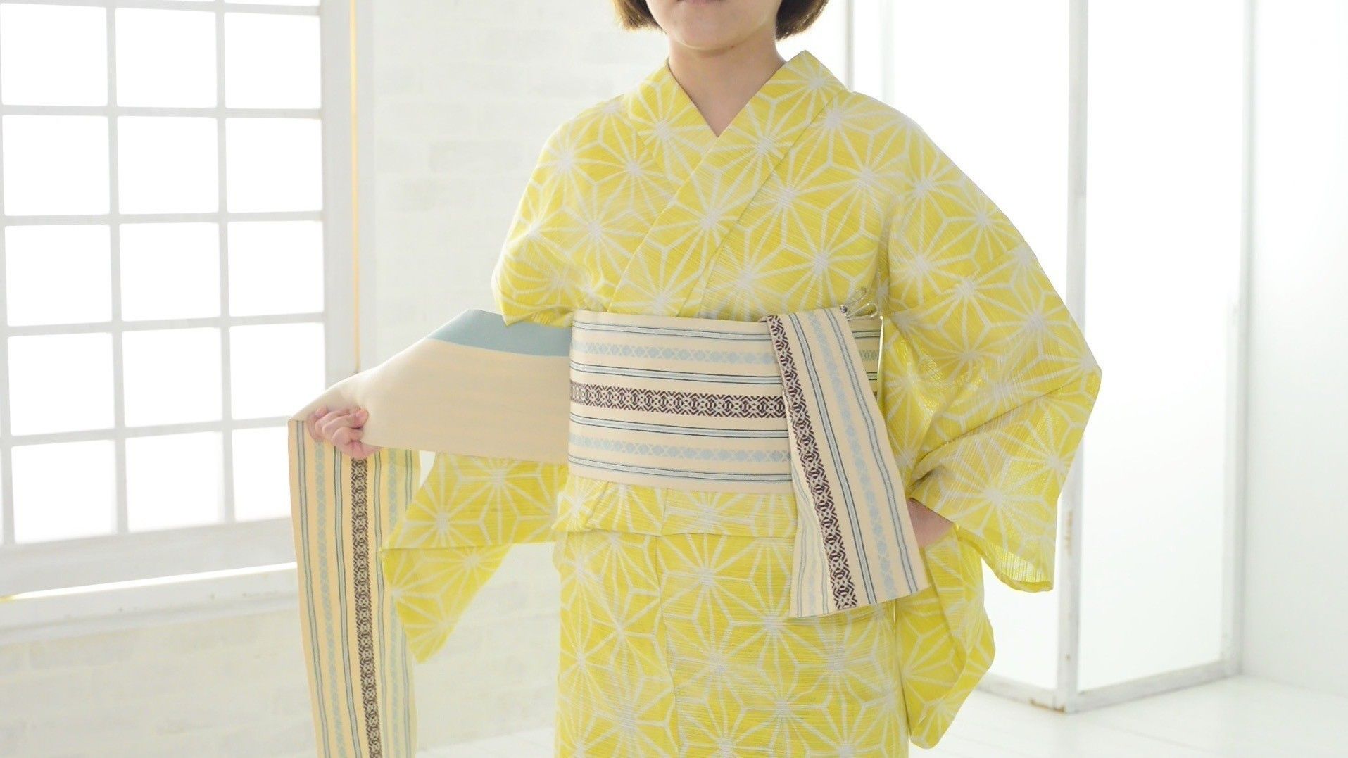 小さめの羽根が特徴の「割角出し(わりつのだし)」は、文庫系の帯結びと比べると、やや落ち着いていてクールな印象。一見難しそうに見えますが、結び目が隠せる帯結びなので、実は初心者にもおすすめです。